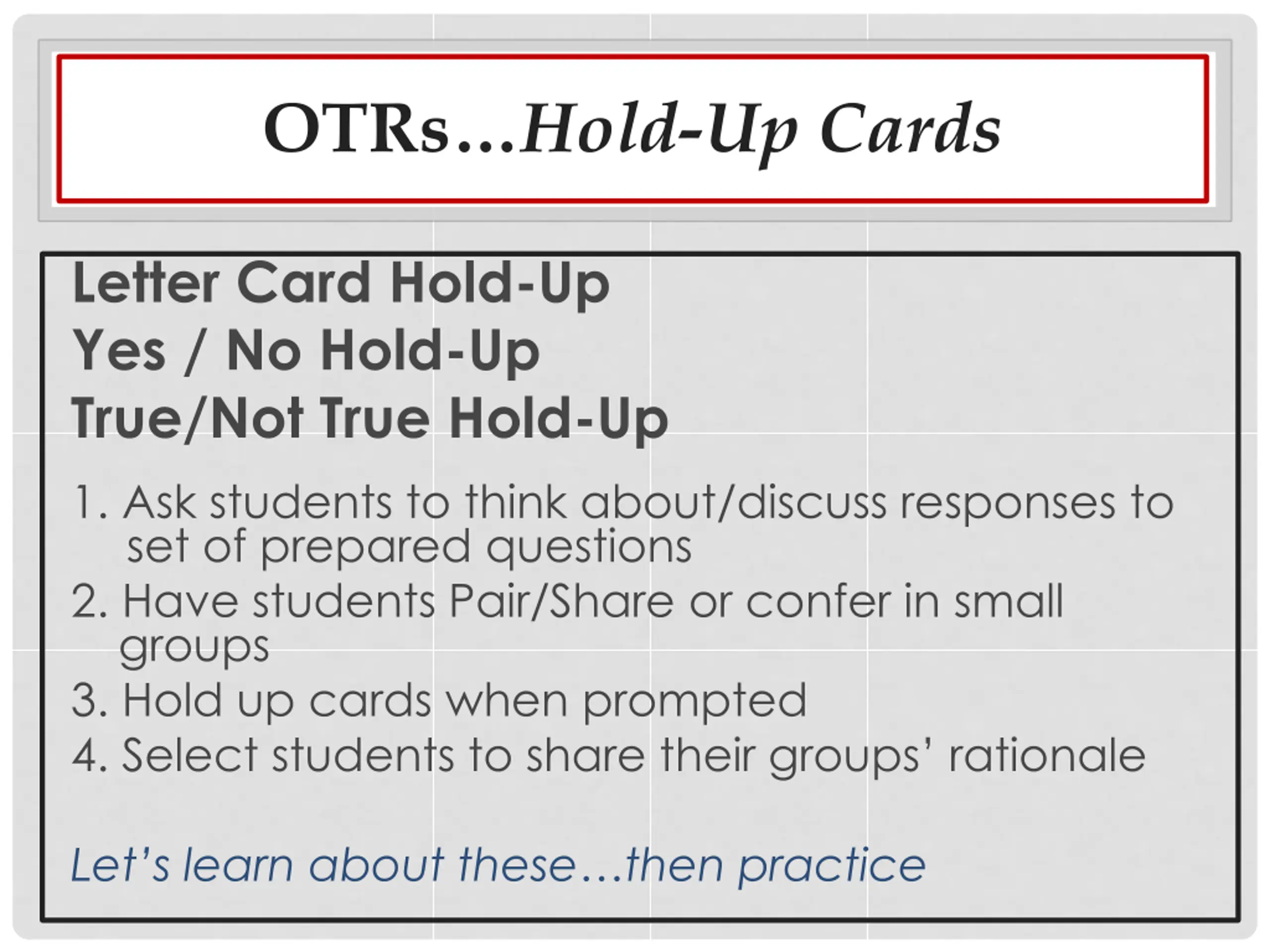 OTRsHold-Up Cards Letter Card Hold-Up Yes / No Hold-Up True/Not True Hold-Up 1. Ask students to think about/discuss responses to set of prepared questions 2. Have students Pair/Share or confer in small groups 3. Hold up cards when prompted 4. Select students to share their groups rationale Let s learn about these then practice