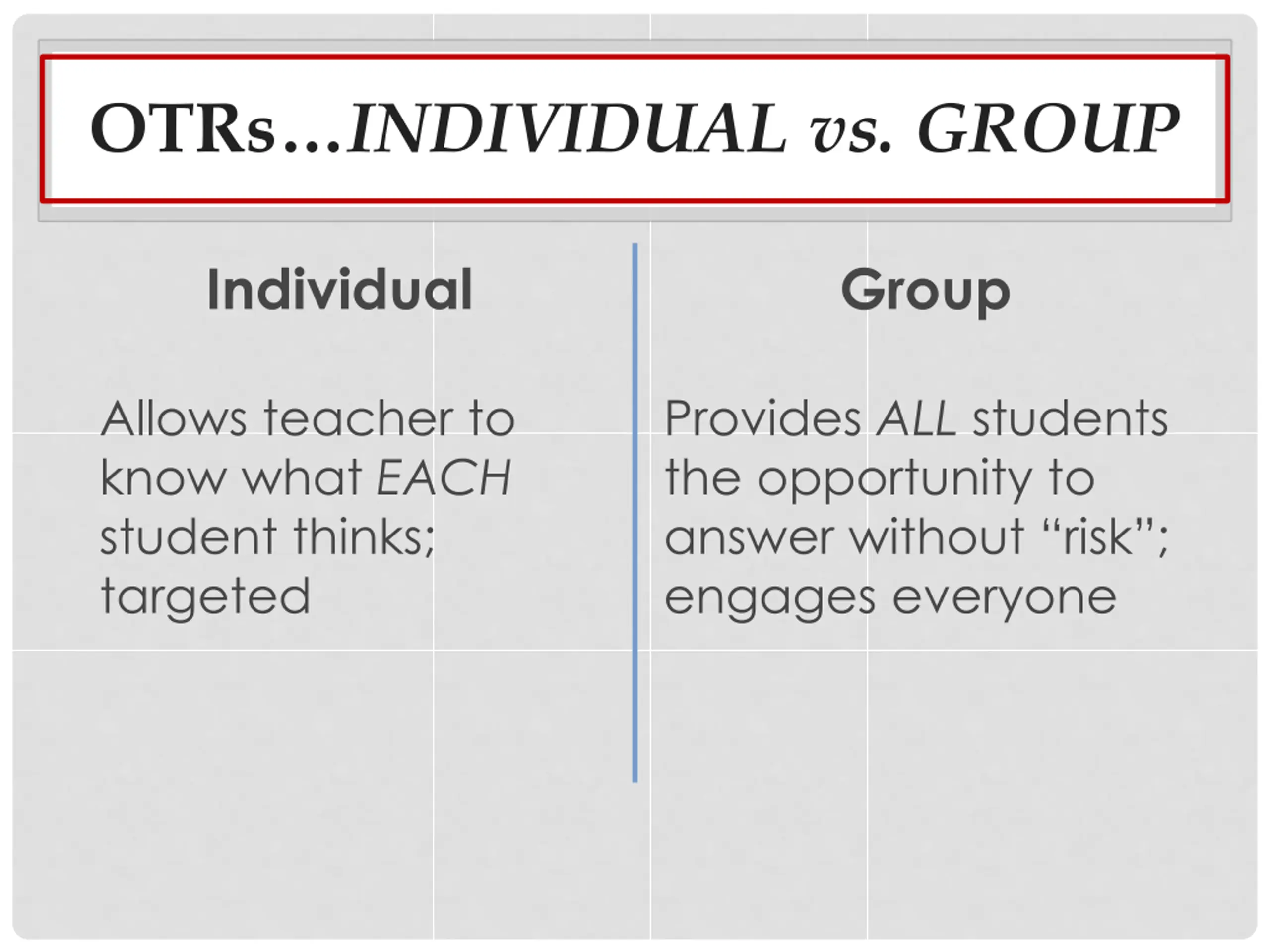 OTRsINDIVIDUAL vs. GROUP Individual Group Allows teacher to know what EACH student thinks; targeted Provides ALL students the opportunity to answer without risk ; engages everyone