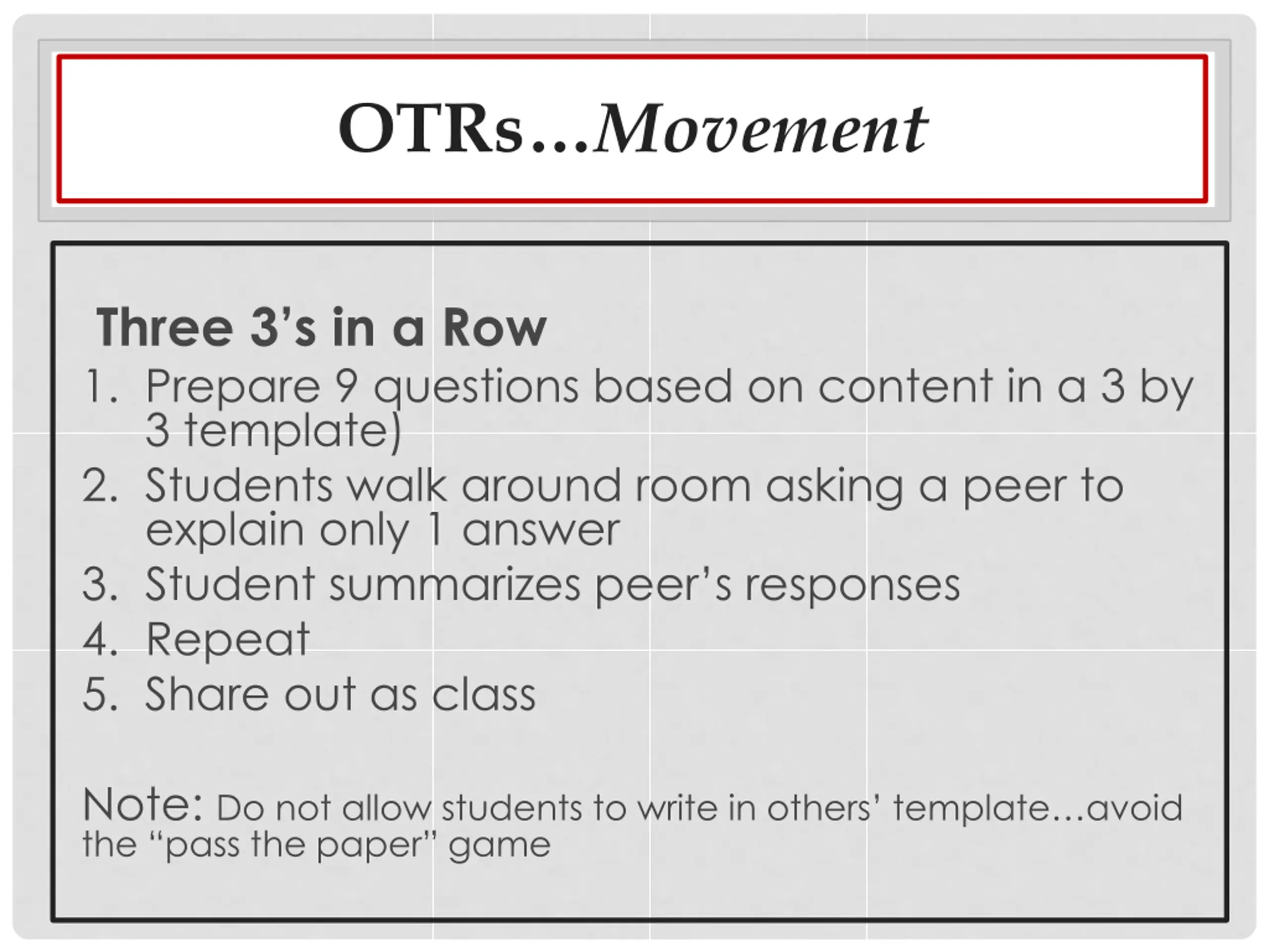 OTRsMovement Three 3 s in a Row 1. Prepare 9 questions based on content in a 3 by 3 template) 2. Students walk around room asking a peer to explain only 1 answer 3. Student summarizes peer s responses 4. Repeat 5. Share out as class Note: Do not allow students to write in others template avoid the pass the paper game