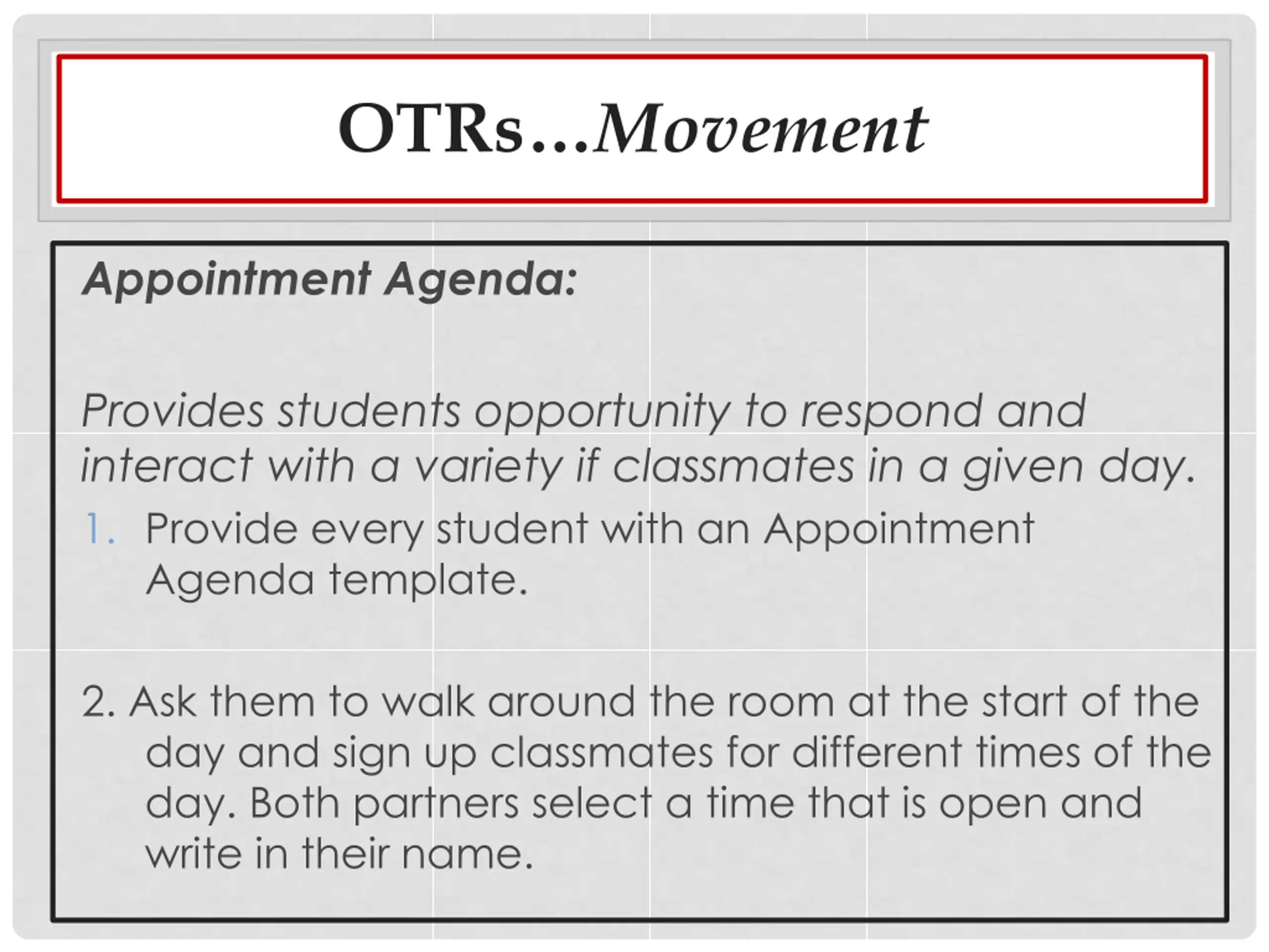 OTRsMovement Appointment Agenda: Provides students opportunity to respond and interact with a variety if classmates in a given day. 1. Provide every student with an Appointment Agenda template. 2. Ask them to walk around the room at the start of the day and sign up classmates for different times of the day. Both partners select a time that is open and write in their name.