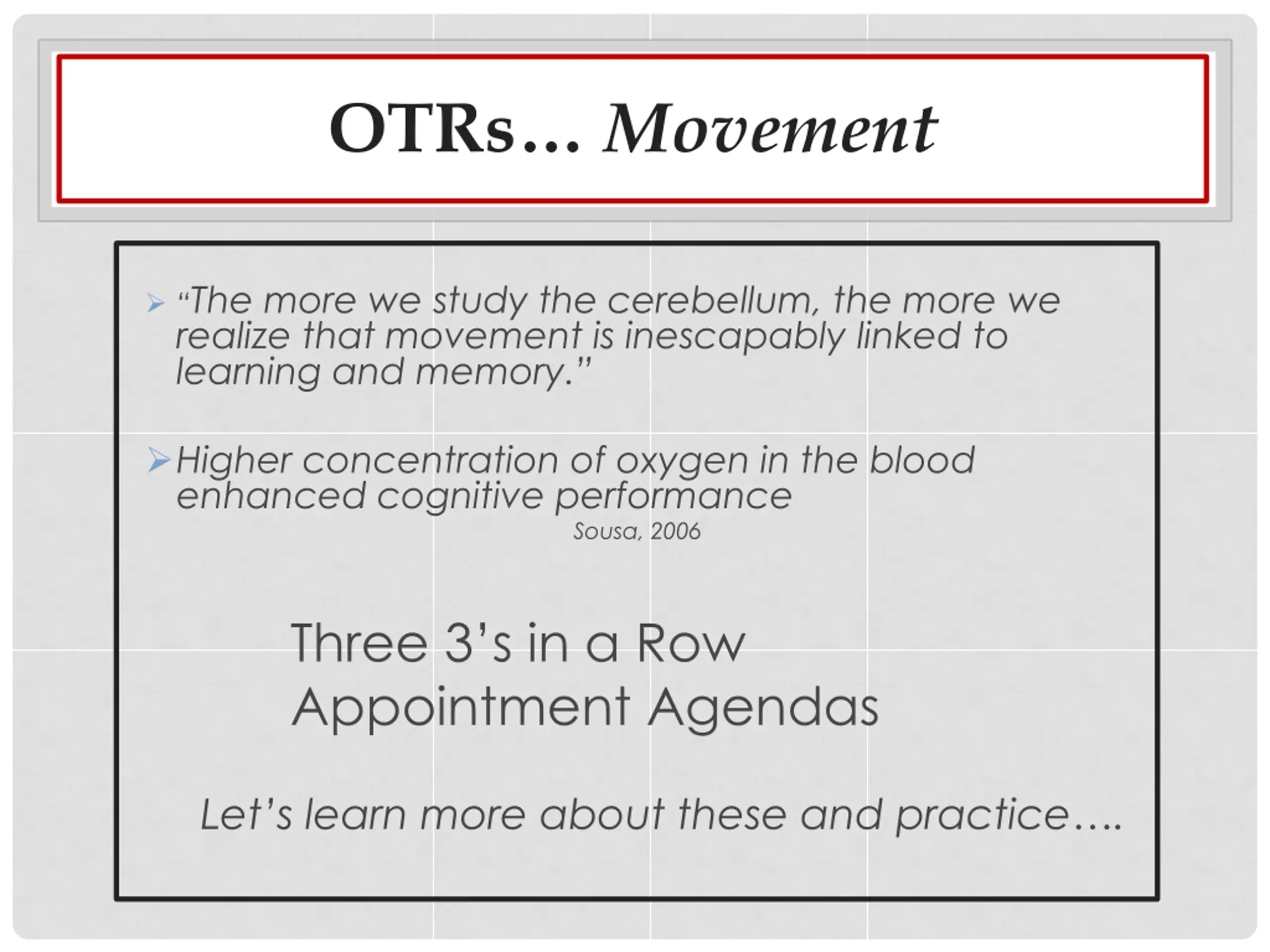 OTRs Movement The more we study the cerebellum, the more we realize that movement is inescapably linked to learning and memory. Higher concentration of oxygen in the blood enhanced cognitive performance Sousa, 2006 Appointment Agendas Let s learn more about these and practice . Three 3 s in a Row
