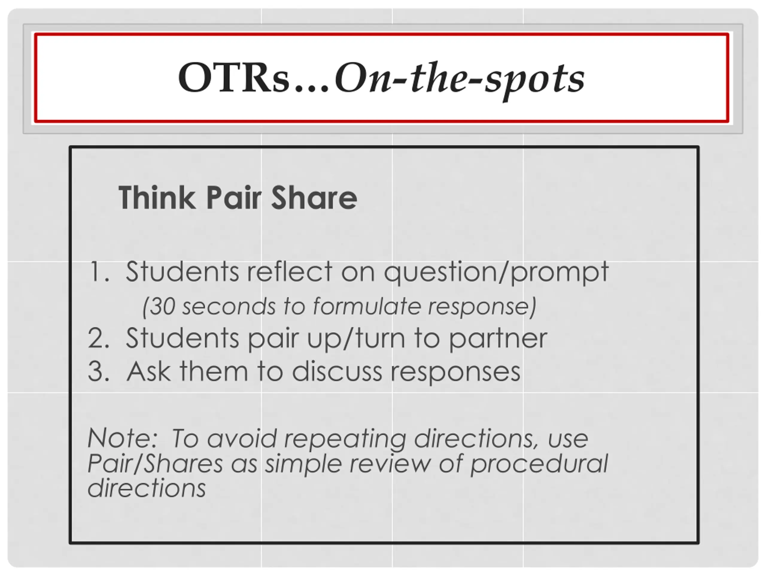 OTRsOn-the-spots Think Pair Share 1. Students reflect on question/prompt (30 seconds to formulate response) 2. Students pair up/turn to partner 3. Ask them to discuss responses Note: To avoid repeating directions, use Pair/Shares as simple review of procedural directions