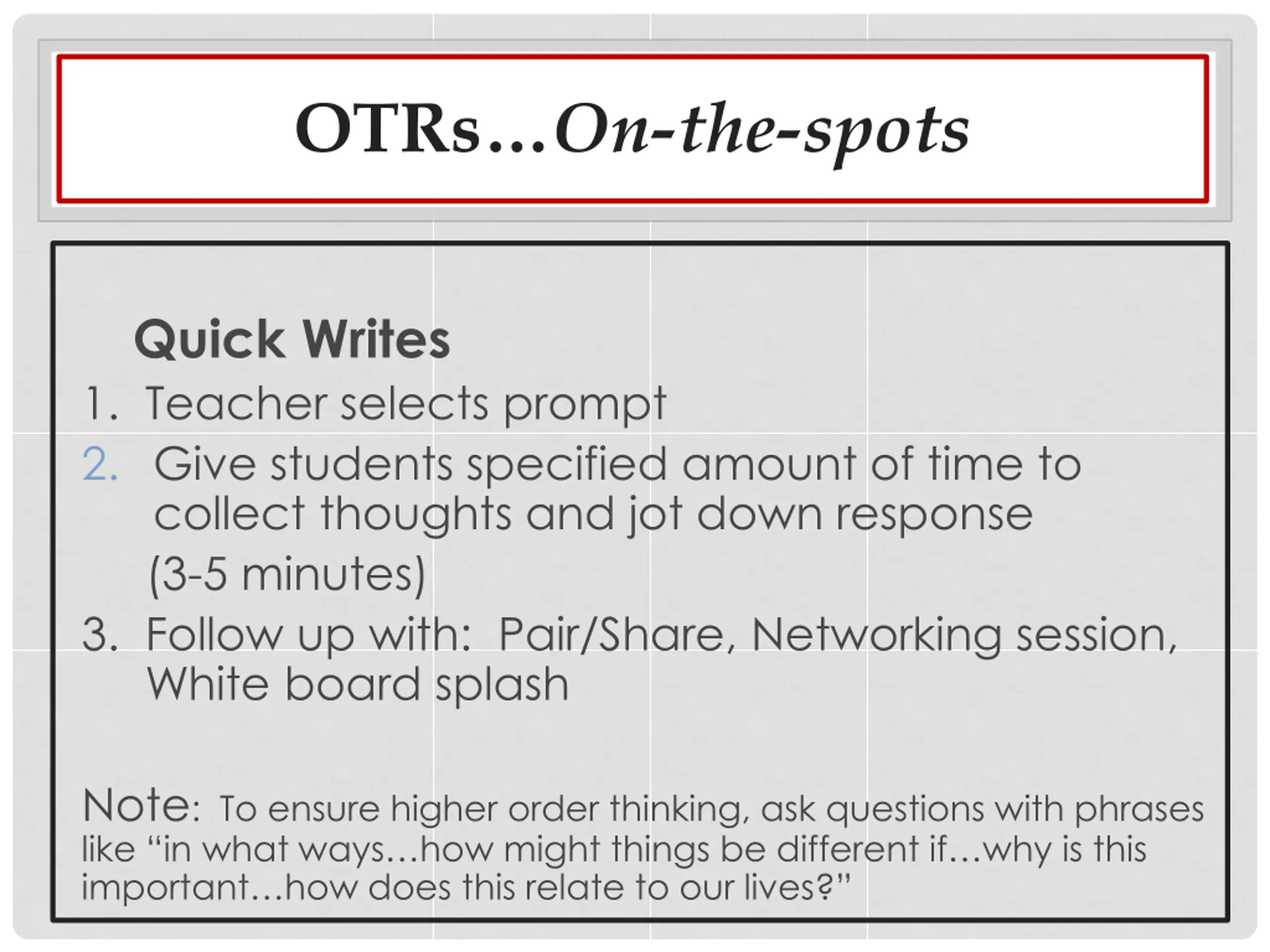 OTRsOn-the-spots Quick Writes 1. Teacher selects prompt 2. Give students specified amount of time to collect thoughts and jot down response (3-5 minutes) 3. Follow up with: Pair/Share, Networking session, White board splash Note: To ensure higher order thinking, ask questions with phrases like in what ways how might things be different if why is this important how does this relate to our lives?