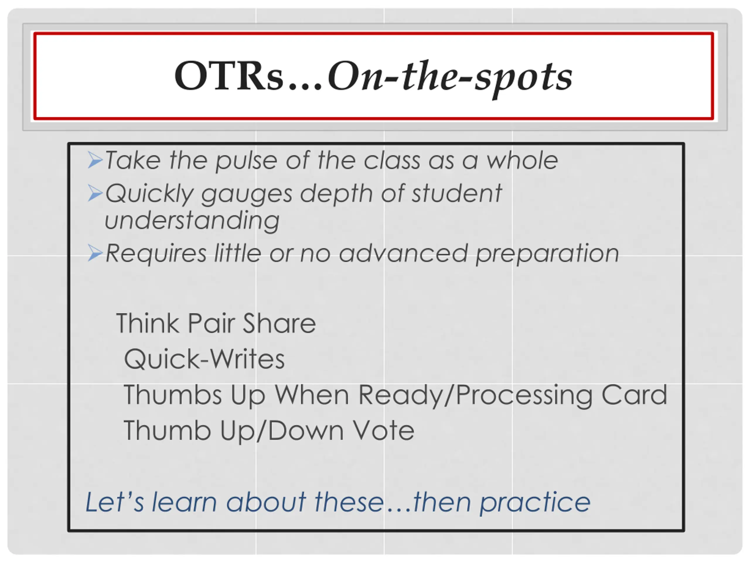 OTRsOn-the-spots Take the pulse of the class as a whole Quickly gauges depth of student understanding Requires little or no advanced preparation Think Pair Share Quick-Writes Thumbs Up When Ready/Processing Card Thumb Up/Down Vote Let s learn about these then practice