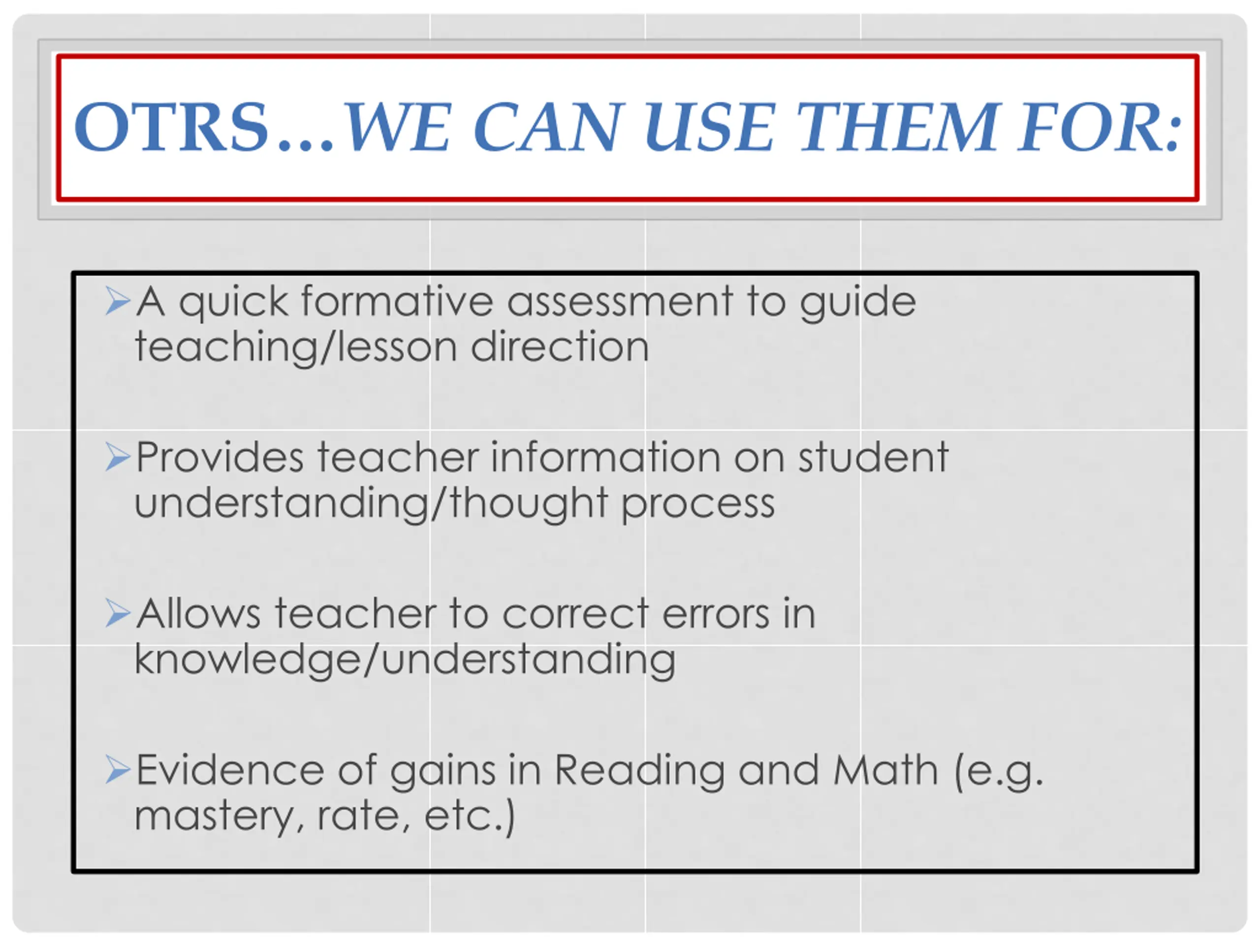 OTRSWE CAN USE THEM FOR: A quick formative assessment to guide teaching/lesson direction Provides teacher information on student understanding/thought process Allows teacher to correct errors in knowledge/understanding Evidence of gains in Reading and Math (e.g. mastery, rate, etc.)