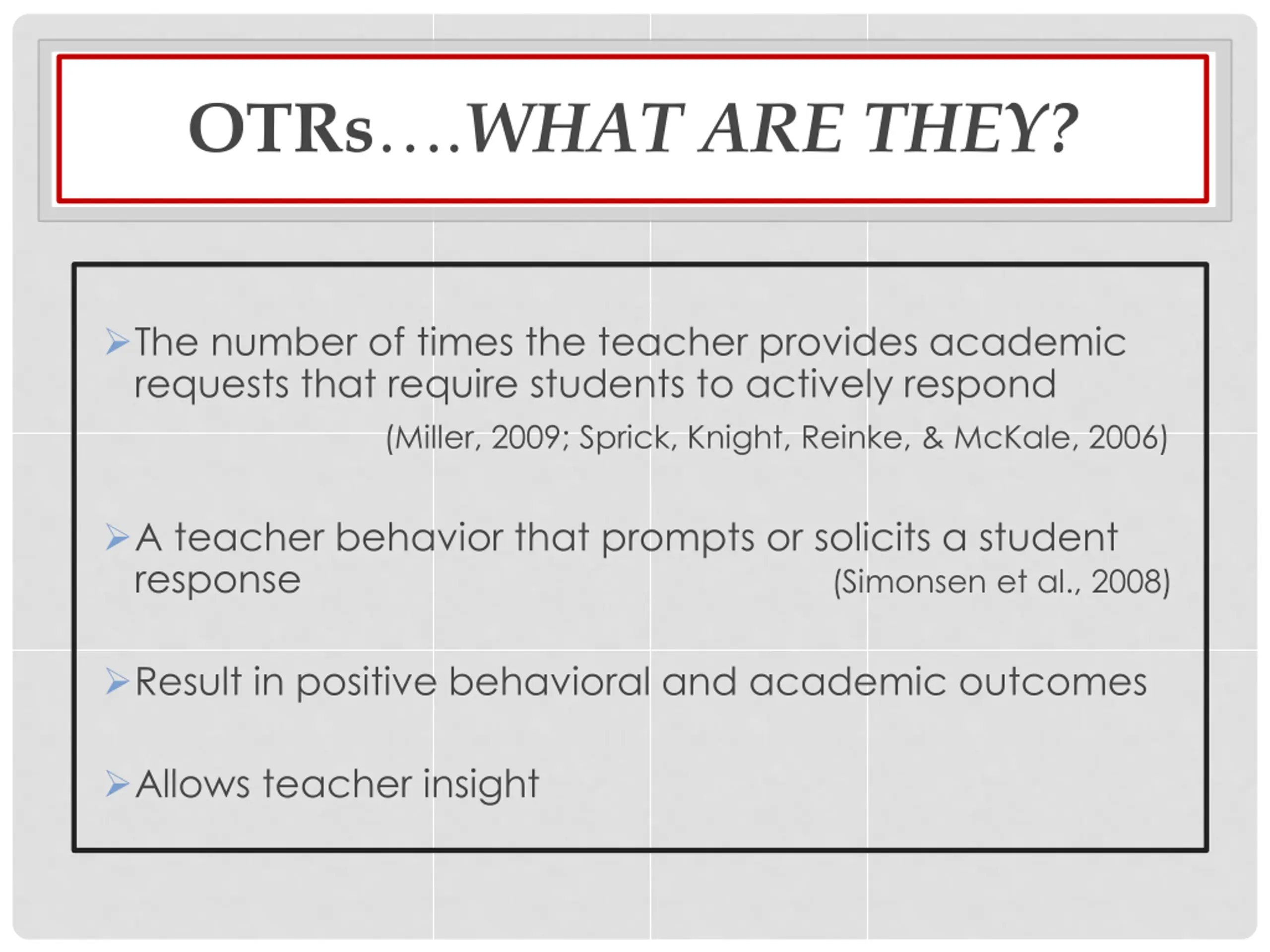 OTRs.WHAT ARE THEY? The number of times the teacher provides academic requests that require students to actively respond (Miller, 2009; Sprick, Knight, Reinke, & McKale, 2006) A teacher behavior that prompts or solicits a student response (Simonsen et al., 2008) Result in positive behavioral and academic outcomes Allows teacher insight