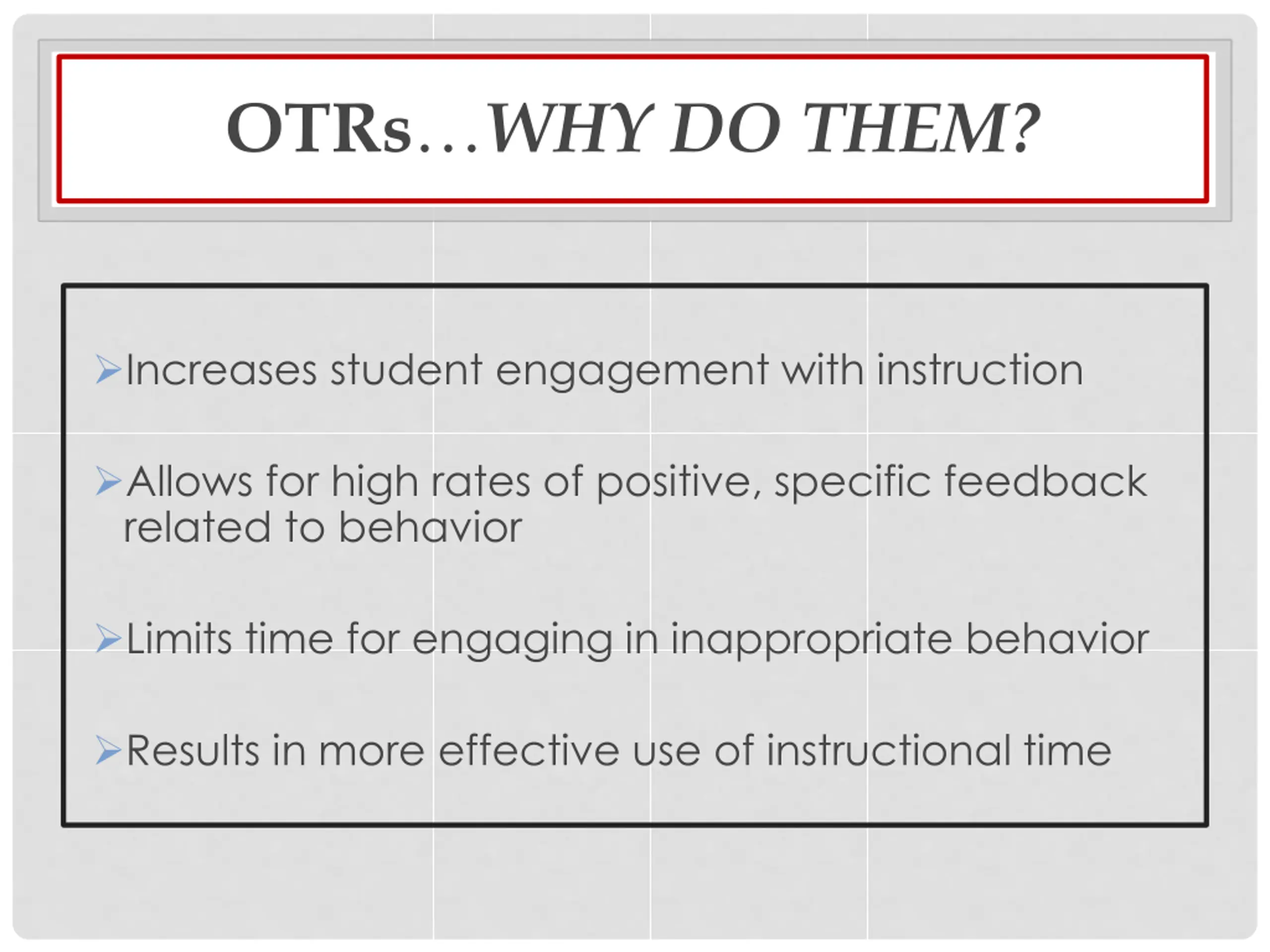 OTRsWHY DO THEM? Increases student engagement with instruction Allows for high rates of positive, specific feedback related to behavior Limits time for engaging in inappropriate behavior Results in more effective use of instructional time