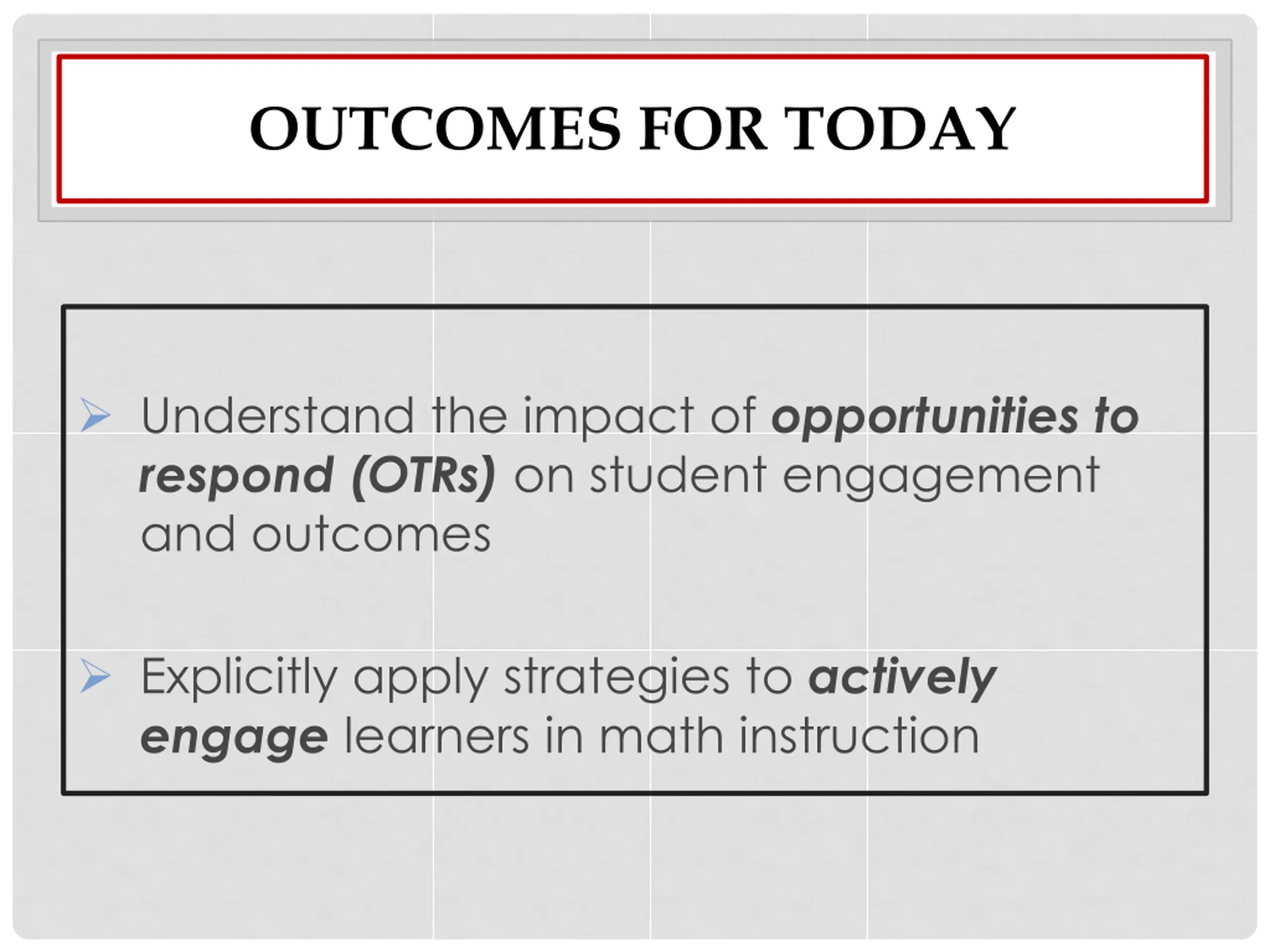 OUTCOMES FOR TODAY Understand the impact of opportunities to respond (OTRs) on student engagement and outcomes Explicitly apply strategies to actively engage learners in math instruction