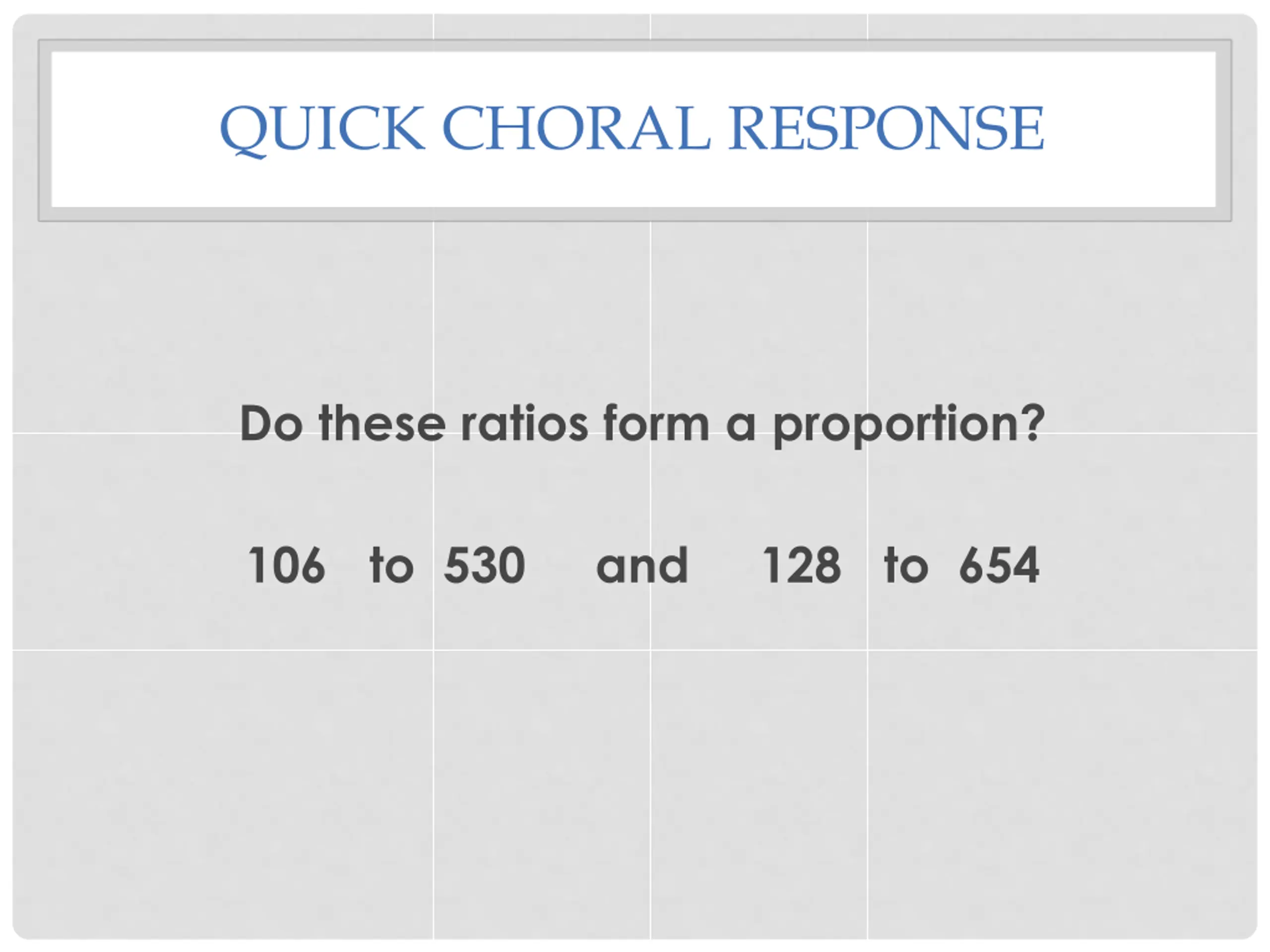 QUICK CHORAL RESPONSE Do these ratios form a proportion? 106 to 530 and 128 to 654