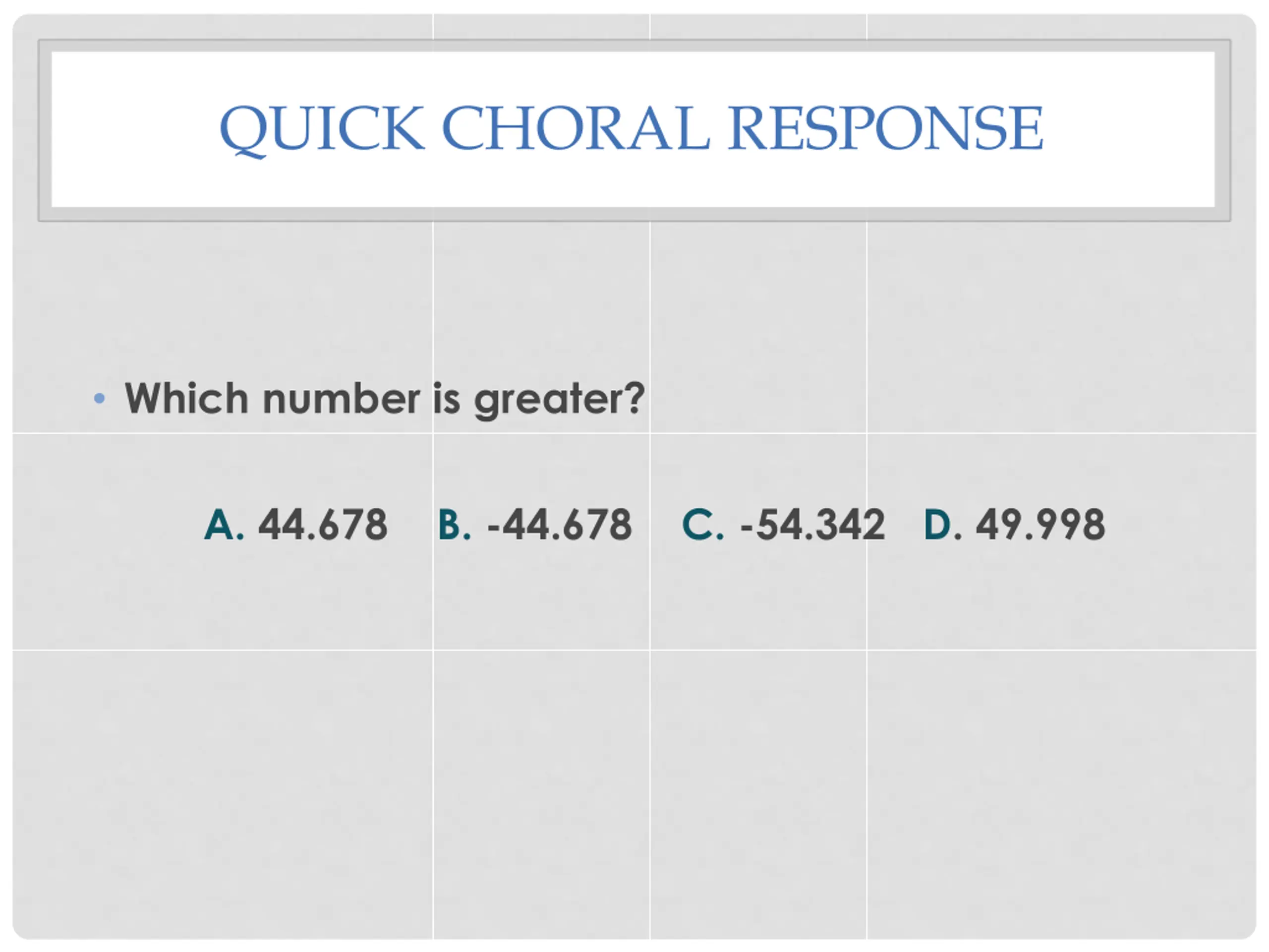 QUICK CHORAL RESPONSE Which number is greater? A. 44.678 B. -44.678 C. -54.342 D. 49.998