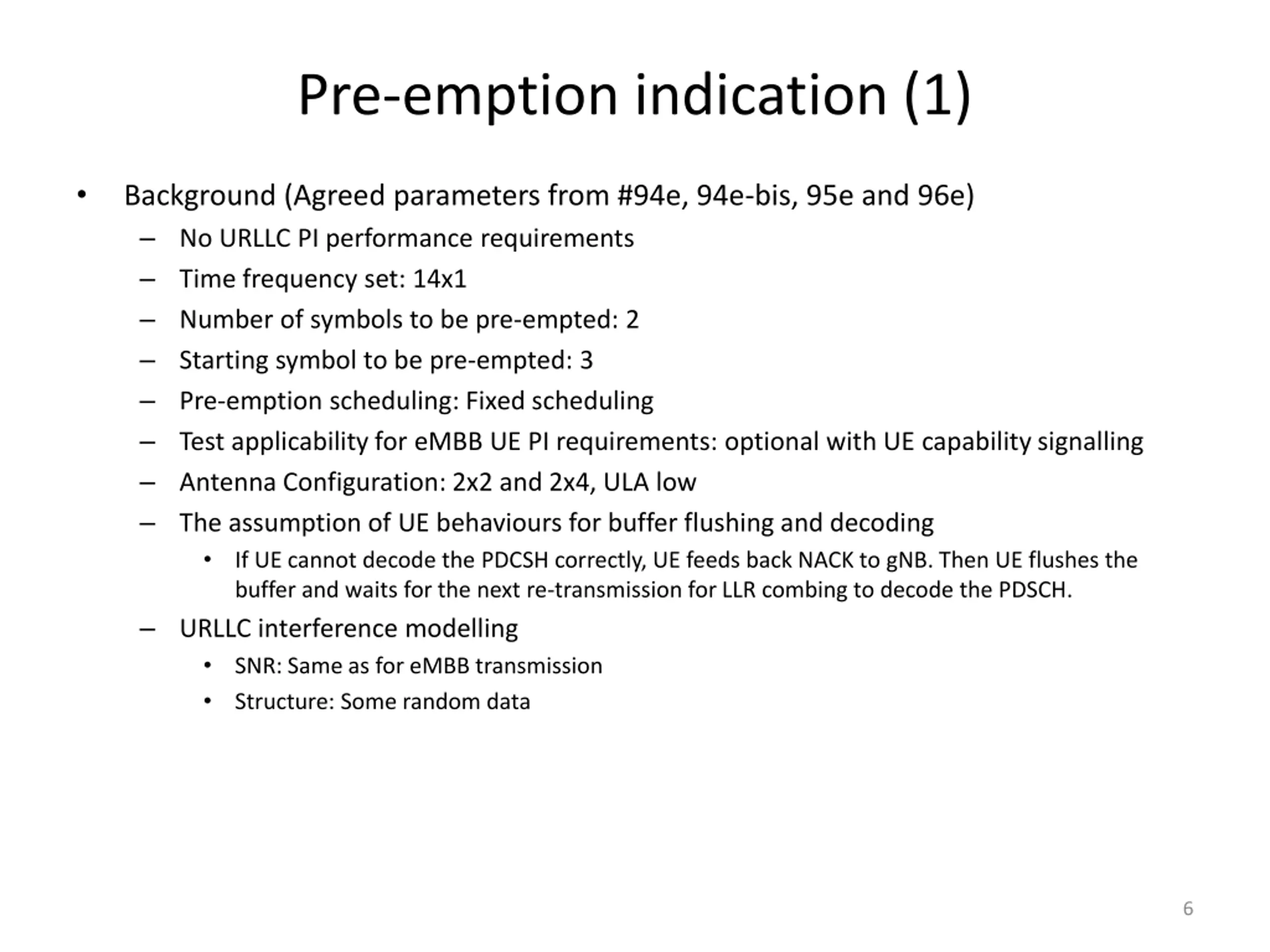 Pre-emption indication (3) Pre-emption probability 10% within 1 radio frame Pre-emption pattern for TDD [0 1 0 0 0 0 0 0 0 0, 0 0 1 0 0 0 0 0 0 0, 0 0 0 1 0 0 0 0 0 0, 0 0 0 0 1 0 0 0 0 0] eMBB MCS MCS 16 in Table 1 Test metric 70% of max T-put 8