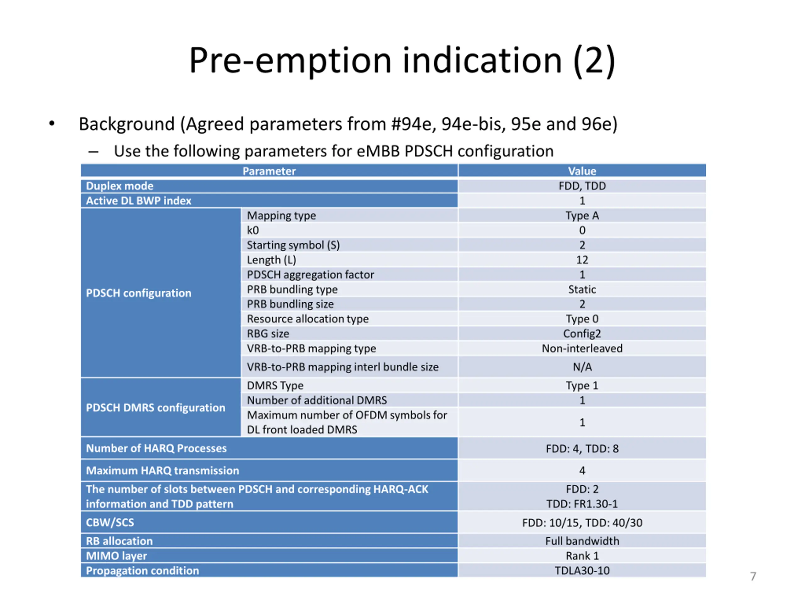 Pre-emption indication (2) Background (Agreed parameters from #94e, 94e-bis, 95e and 96e) Use the following parameters for eMBB PDSCH configuration Parameter Duplex mode Active DL BWP index Mapping type k0 Starting symbol (S) Length (L) PDSCH aggregation factor PRB bundling type PRB bundling size Resource allocation type RBG size VRB-to-PRB mapping type Value FDD, TDD 1 Type A 0 2 12 1 Static 2 Type 0 Config2 Non-interleaved PDSCH configuration VRB-to-PRB mapping interl bundle size N/A DMRS Type Number of additional DMRS Maximum number of OFDM symbols for DL front loaded DMRS Type 1 1 PDSCH DMRS configuration 1 FDD: 4, TDD: 8 Number of HARQ Processes Maximum HARQ transmission 4 The number of slots between PDSCH and corresponding HARQ-ACK information and TDD pattern FDD: 2 TDD: FR1.30-1 FDD: 10/15, TDD: 40/30 Full bandwidth Rank 1 TDLA30-10 CBW/SCS RB allocation MIMO layer Propagation condition 7