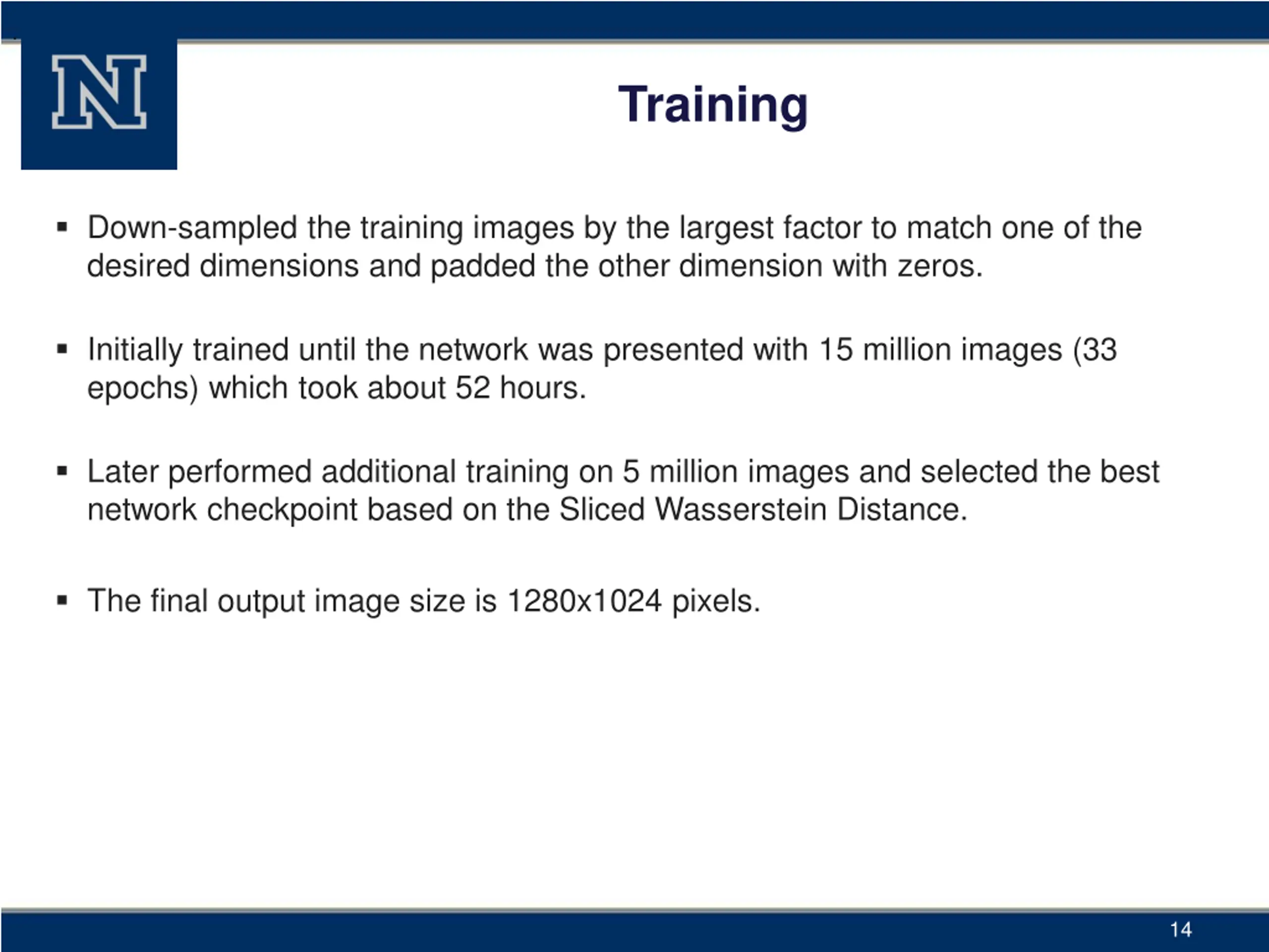 . Training Down-sampled the training images by the largest factor to match one of the desired dimensions and padded the other dimension with zeros. Initially trained until the network was presented with 15 million images (33 epochs) which took about 52 hours. Later performed additional training on 5 million images and selected the best network checkpoint based on the Sliced Wasserstein Distance. The final output image size is 1280x1024 pixels. 14