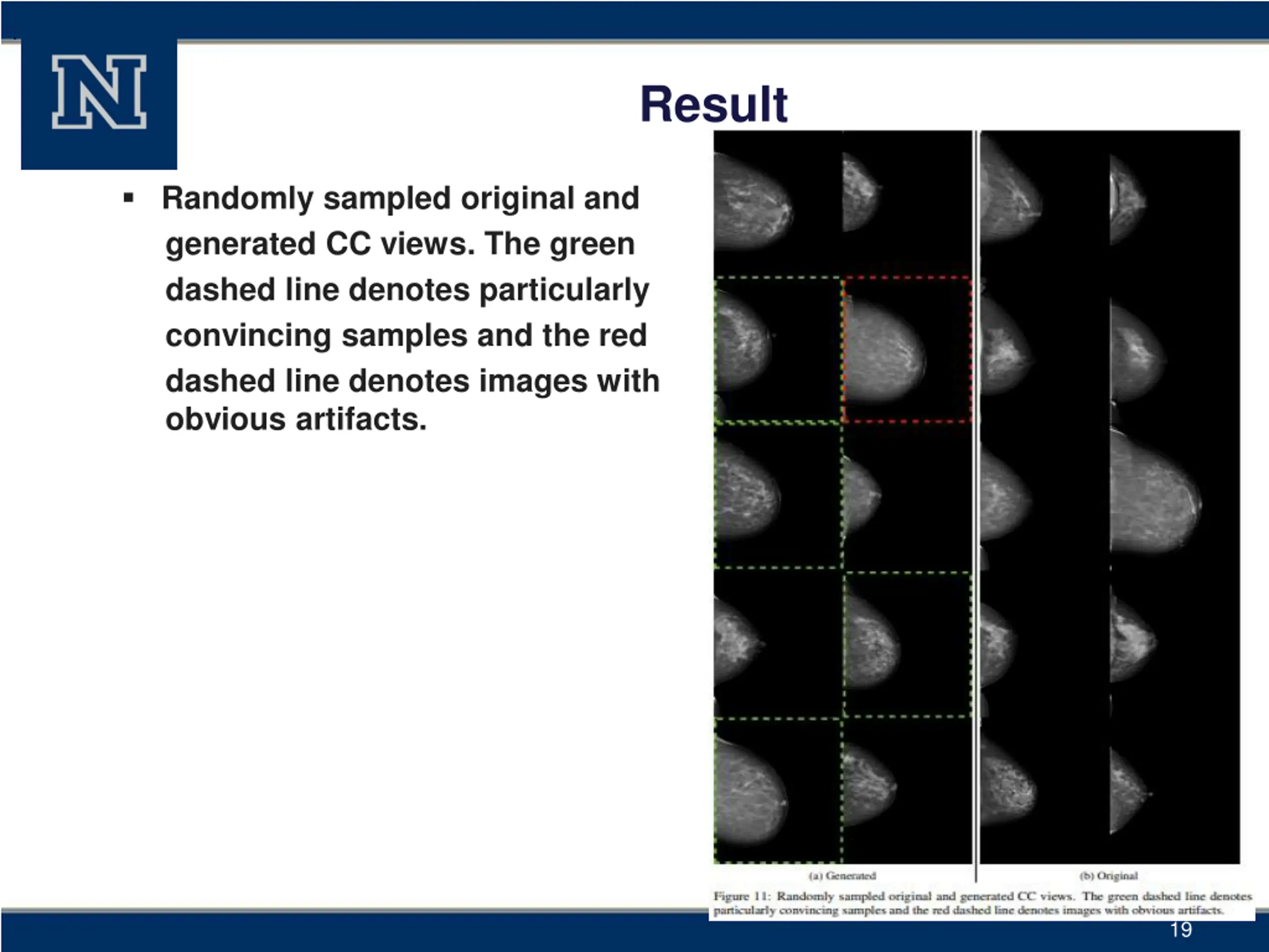 . Result Randomly sampled original and generated CC views. The green dashed line denotes particularly convincing samples and the red dashed line denotes images with obvious artifacts. 19
