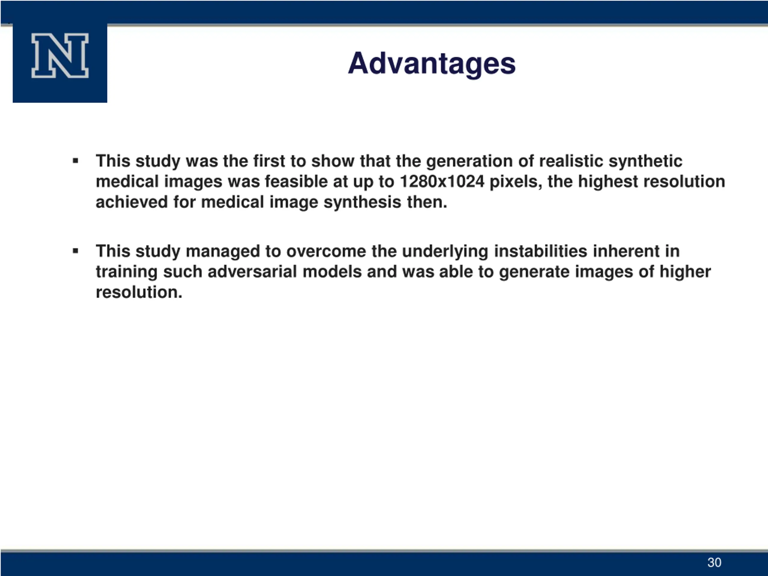 . Advantages This study was the first to show that the generation of realistic synthetic medical images was feasible at up to 1280x1024 pixels, the highest resolution achieved for medical image synthesis then. This study managed to overcome the underlying instabilities inherent in training such adversarial models and was able to generate images of higher resolution. 30