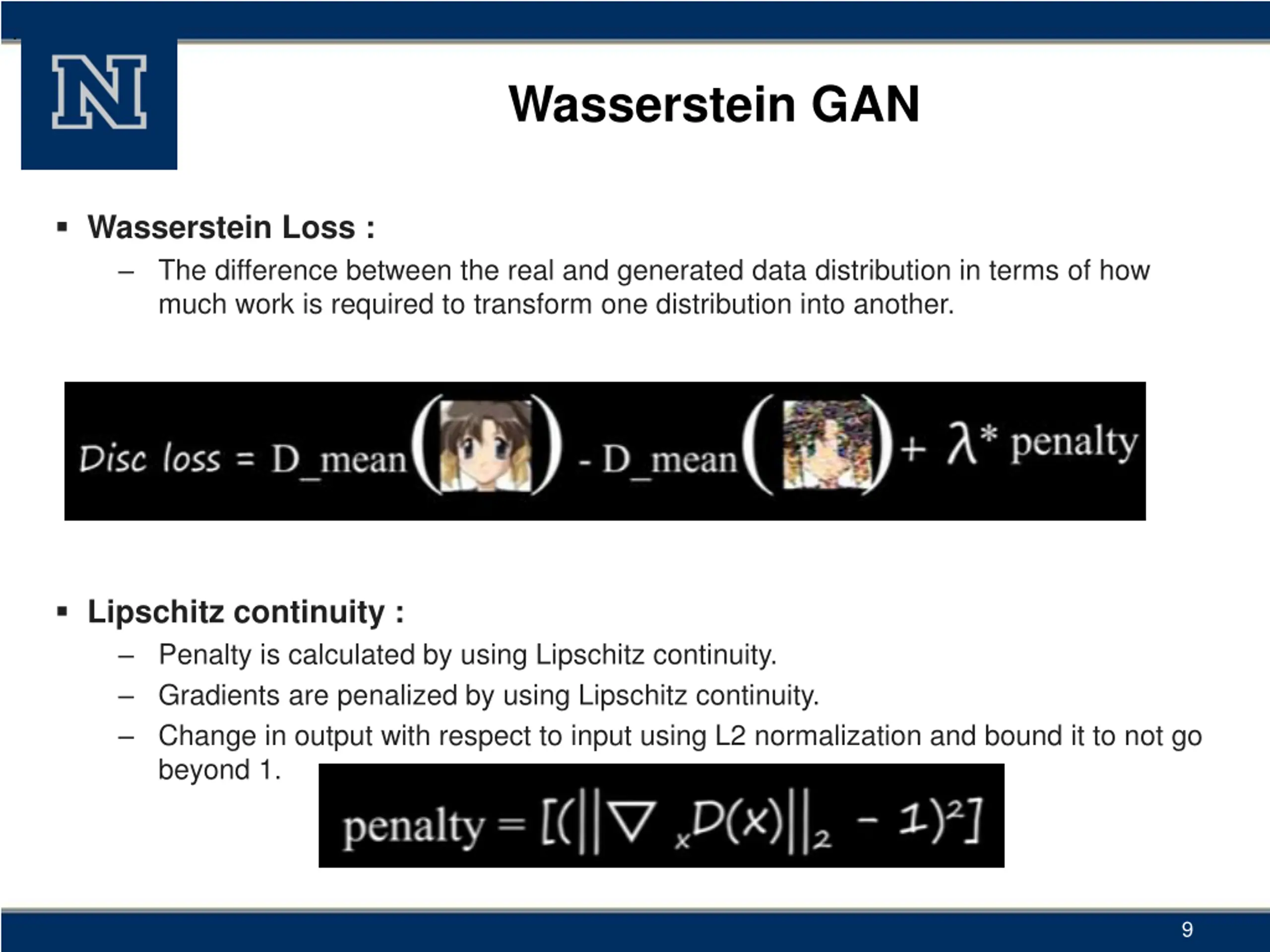 . Wasserstein GAN Wasserstein GAN : The difference between the real and generated data distribution in terms of how much work is required to transform one distribution into another. WGAN aims to minimize the difference between the real and generated data distribution. 8