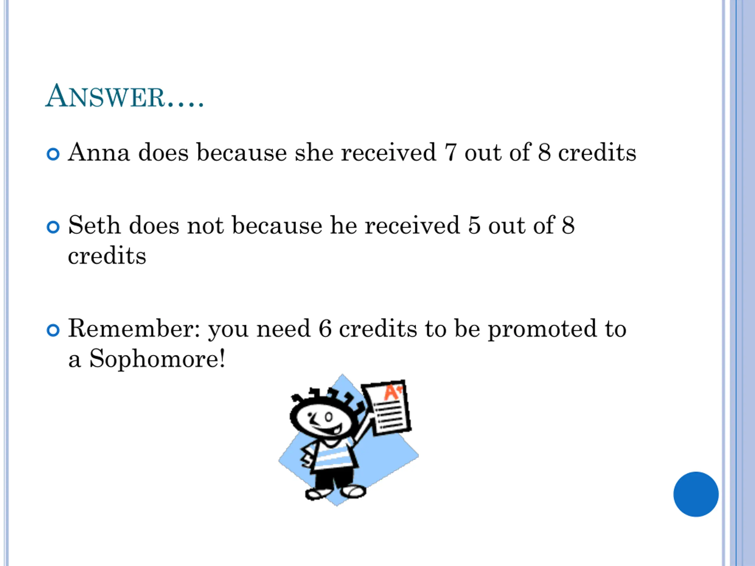 ANSWER. Anna does because she received 7 out of 8 credits Seth does not because he received 5 out of 8 credits Remember: you need 6 credits to be promoted to a Sophomore!