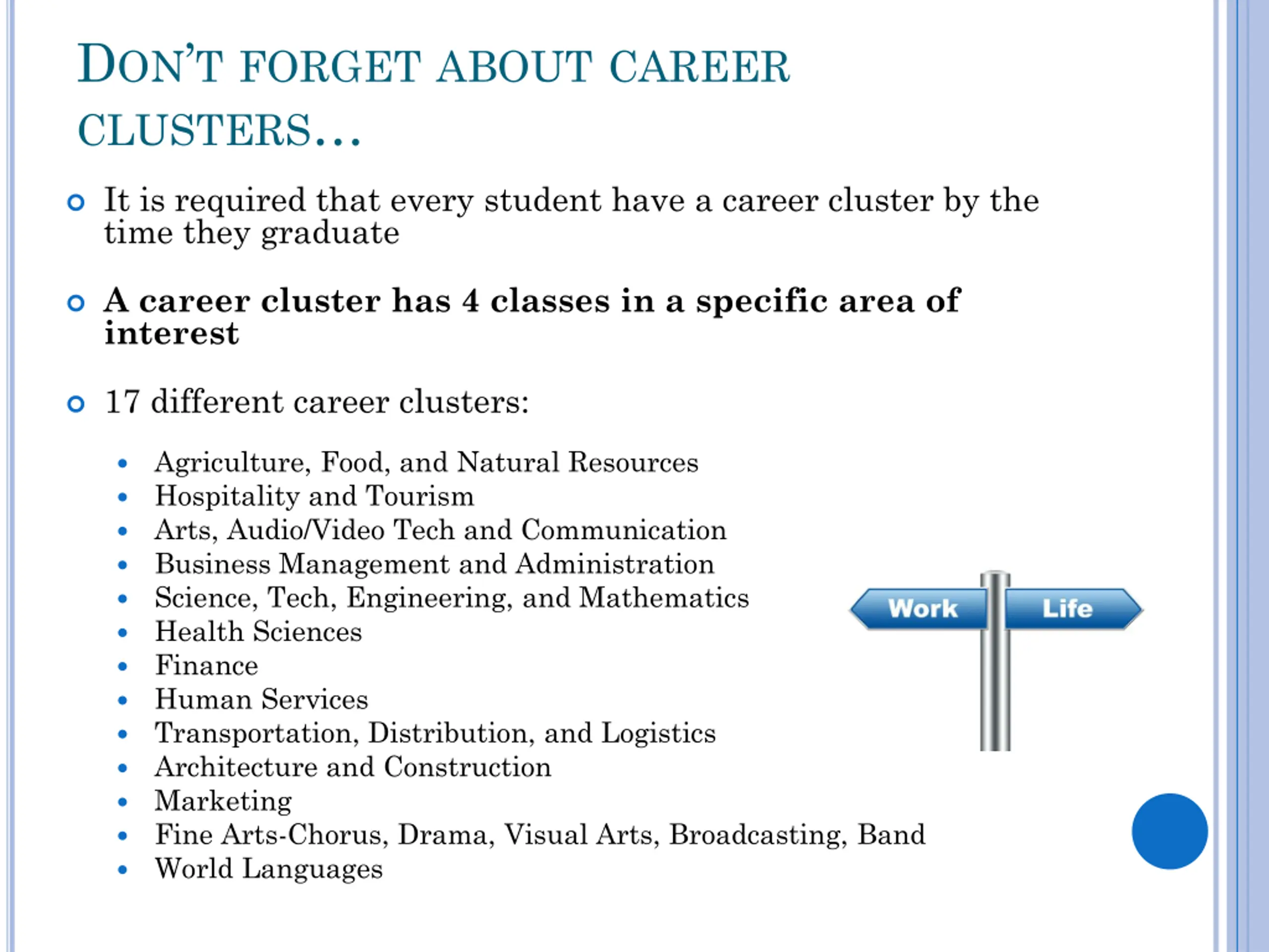 DONT FORGET ABOUT CAREER CLUSTERS It is required that every student have a career cluster by the time they graduate A career cluster has 4 classes in a specific area of interest 17 different career clusters: Agriculture, Food, and Natural Resources Hospitality and Tourism Arts, Audio/Video Tech and Communication Business Management and Administration Science, Tech, Engineering, and Mathematics Health Sciences Finance Human Services Transportation, Distribution, and Logistics Architecture and Construction Marketing Fine Arts-Chorus, Drama, Visual Arts, Broadcasting, Band World Languages