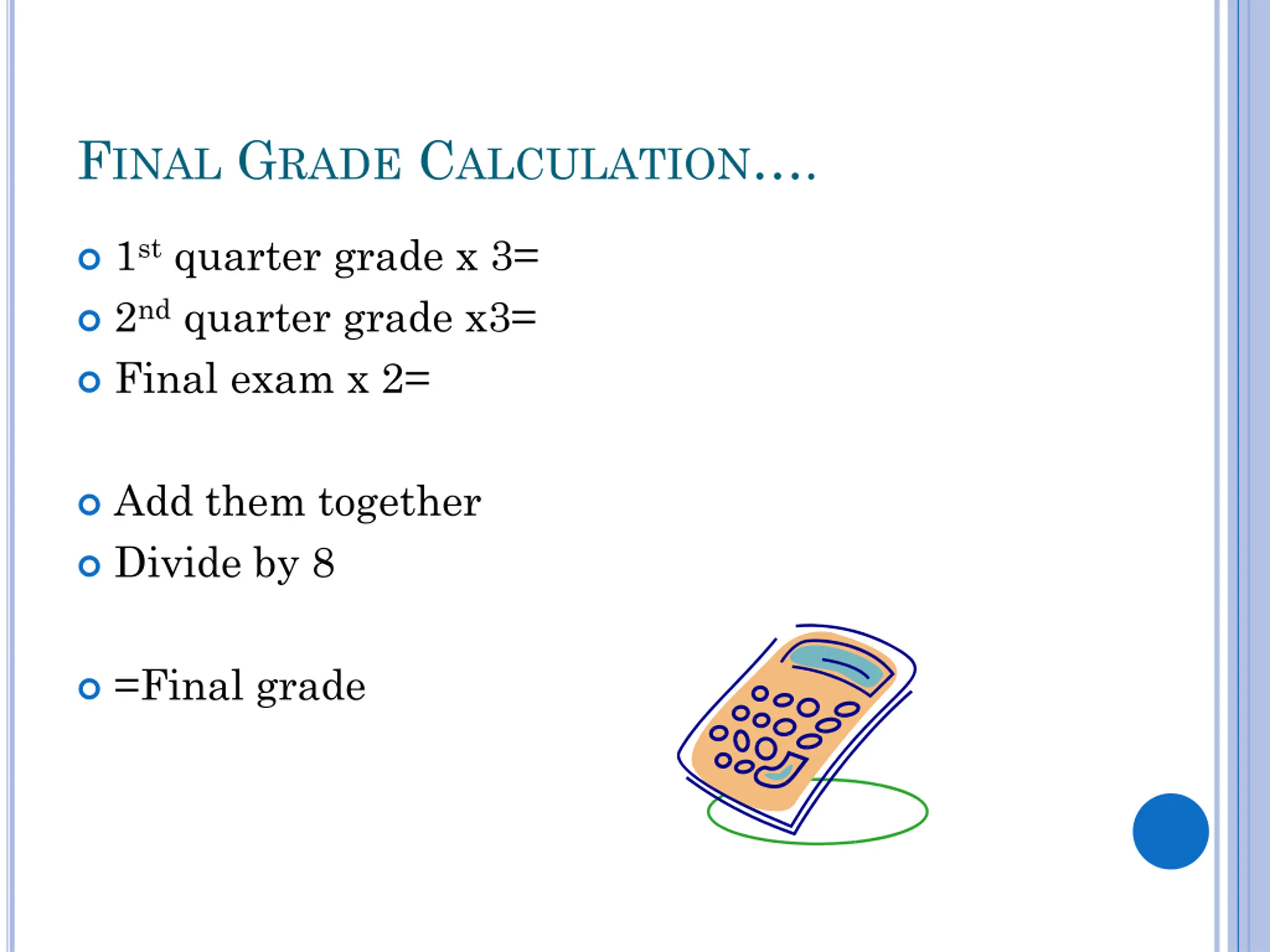 FINAL GRADE CALCULATION. 1stquarter grade x 3= 2ndquarter grade x3= Final exam x 2= Add them together Divide by 8 =Final grade