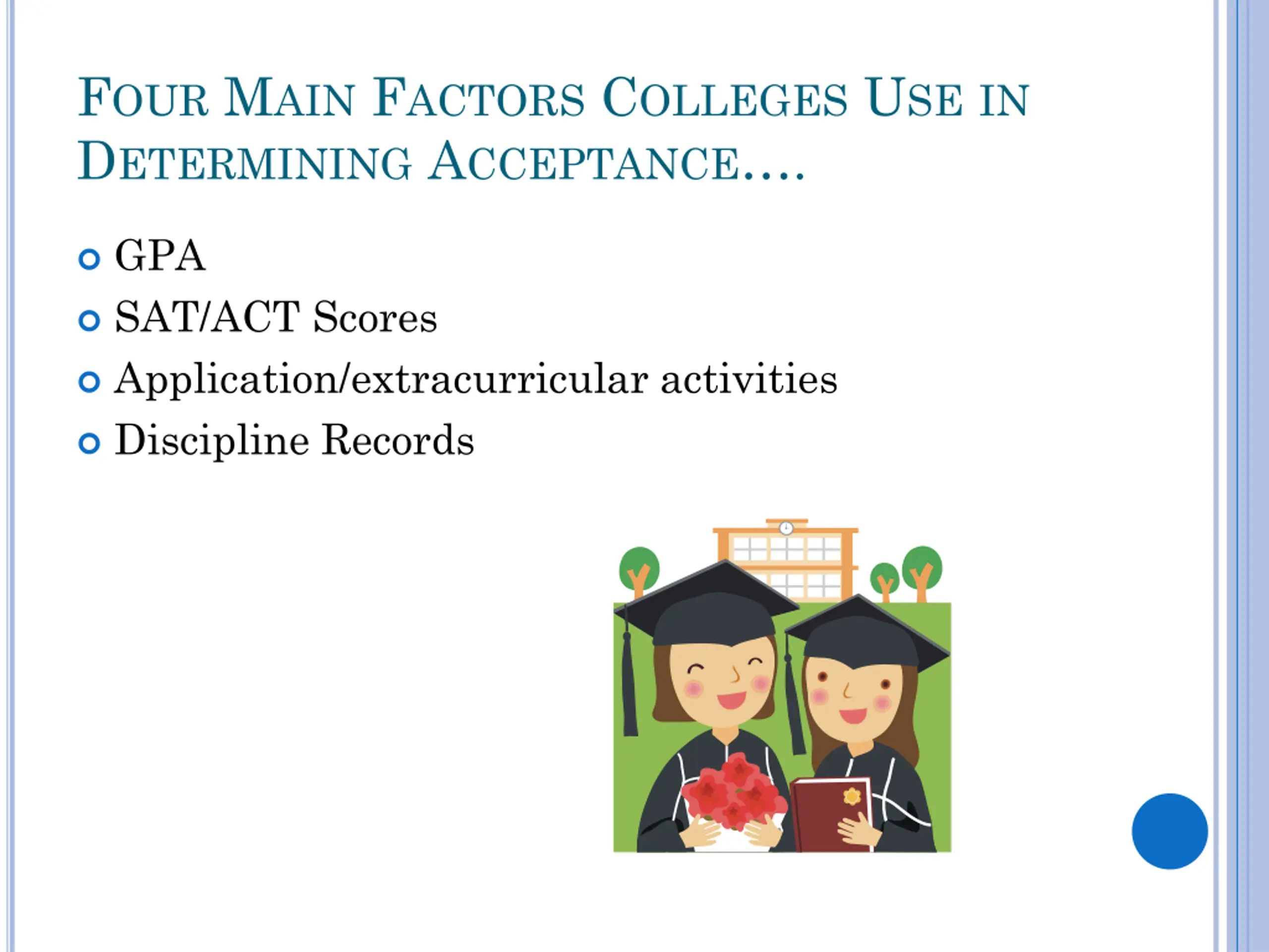 FOUR MAIN FACTORS COLLEGES USE IN DETERMINING ACCEPTANCE . GPA SAT/ACT Scores Application/extracurricular activities Discipline Records