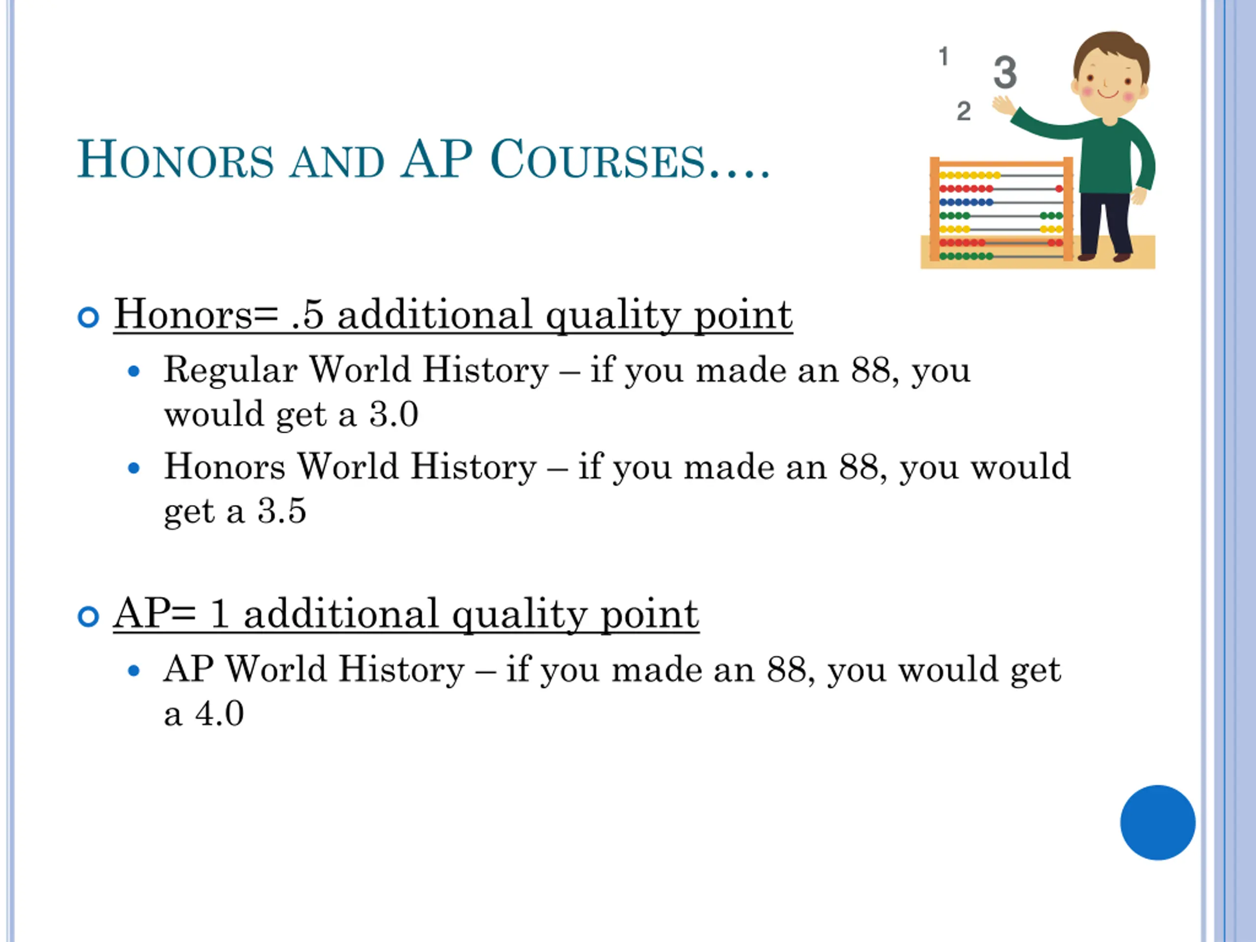 HONORS AND AP COURSES. Honors= .5 additional quality point Regular World History if you made an 88, you would get a 3.0 Honors World History if you made an 88, you would get a 3.5 AP= 1 additional quality point AP World History if you made an 88, you would get a 4.0