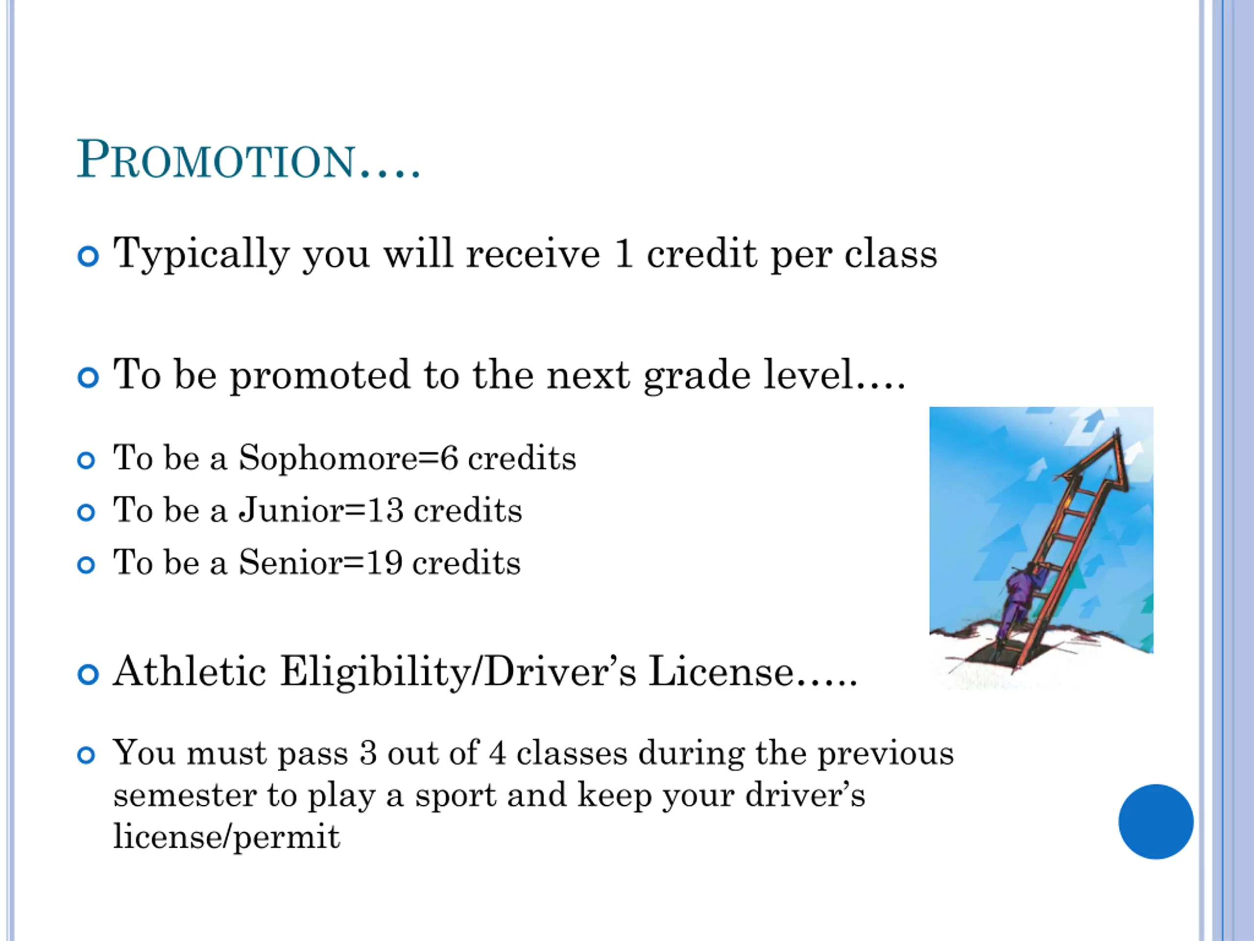 PROMOTION. Typically you will receive 1 credit per class To be promoted to the next grade level . To be a Sophomore=6 credits To be a Junior=13 credits To be a Senior=19 credits Athletic Eligibility/Driver s License .. You must pass 3 out of 4 classes during the previous semester to play a sport and keep your driver s license/permit