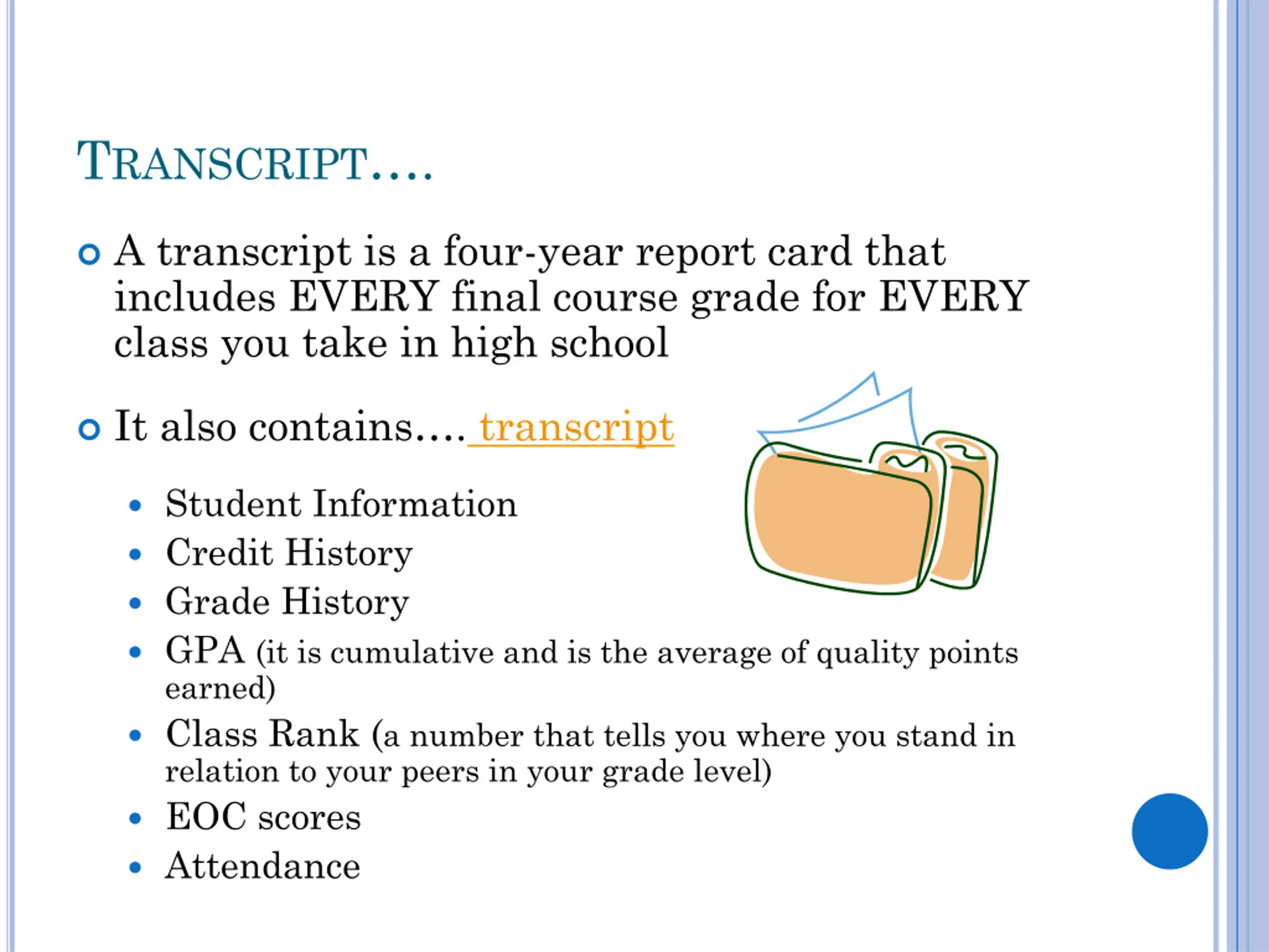 TRANSCRIPT. A transcript is a four-year report card that includes EVERY final course grade for EVERY class you take in high school It also contains . transcript Student Information Credit History Grade History GPA (it is cumulative and is the average of quality points earned) Class Rank (a number that tells you where you stand in relation to your peers in your grade level) EOC scores Attendance