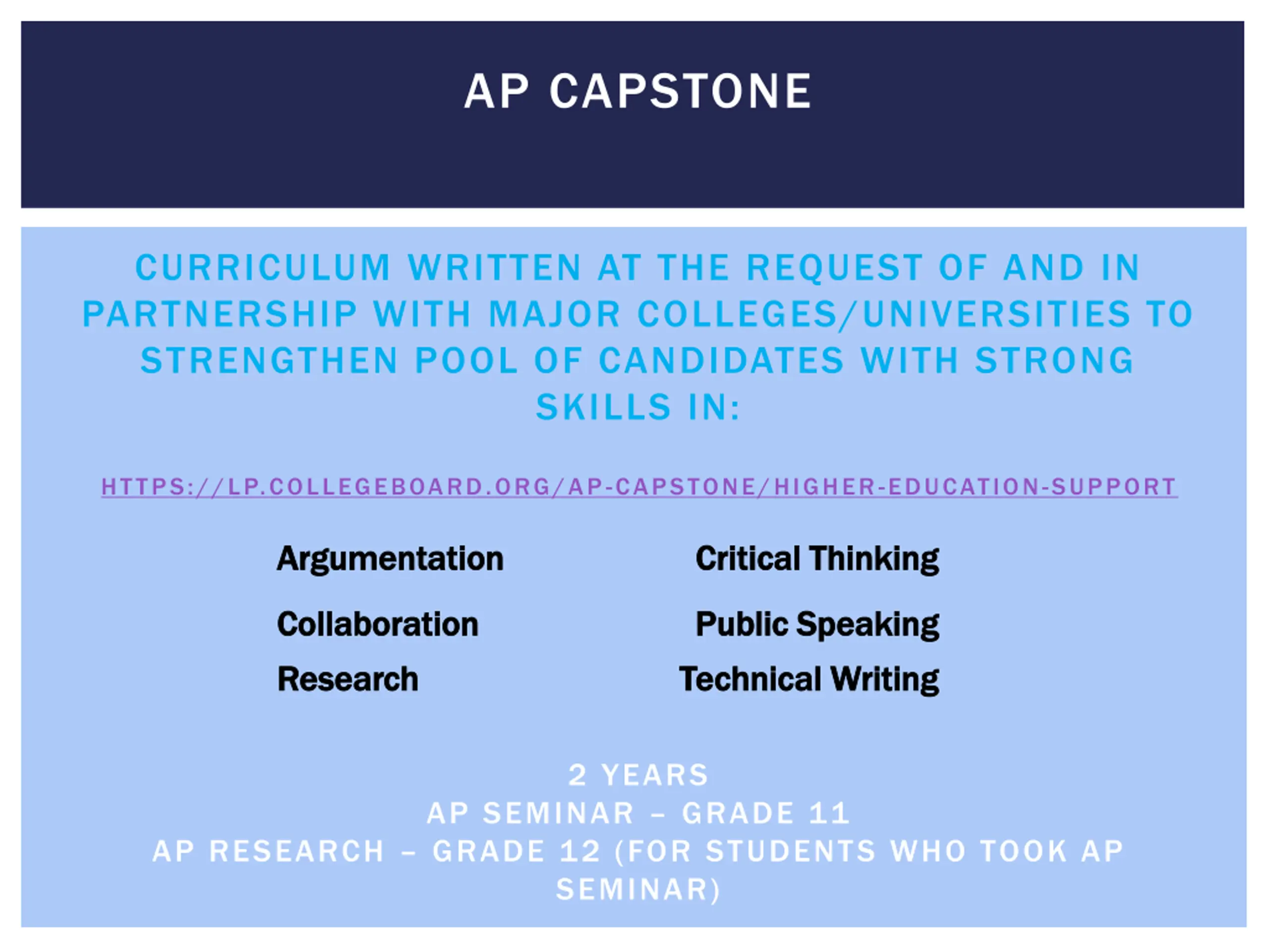 AP CAPSTONE CURRICULUM WRITTEN AT THE REQUEST OF AND IN PARTNERSHIP WITH MAJOR COLLEGES/UNIVERSITIES TO STRENGTHEN POOL OF CANDIDATES WITH STRONG SKILLS IN: HTTPS://LP.COLLEGEBOARD.ORG/AP-CAPSTONE/HIGHER-EDUCATION-SUPPORT Argumentation Argumentation Critical Thinking Critical Thinking Collaboration Collaboration Research Research Public Public Speaking Speaking Technical Writing Technical Writing 2 YEARS AP SEMINAR GRADE 11 AP RESEARCH GRADE 12 (FOR STUDENTS WHO TOOK AP SEMINAR)