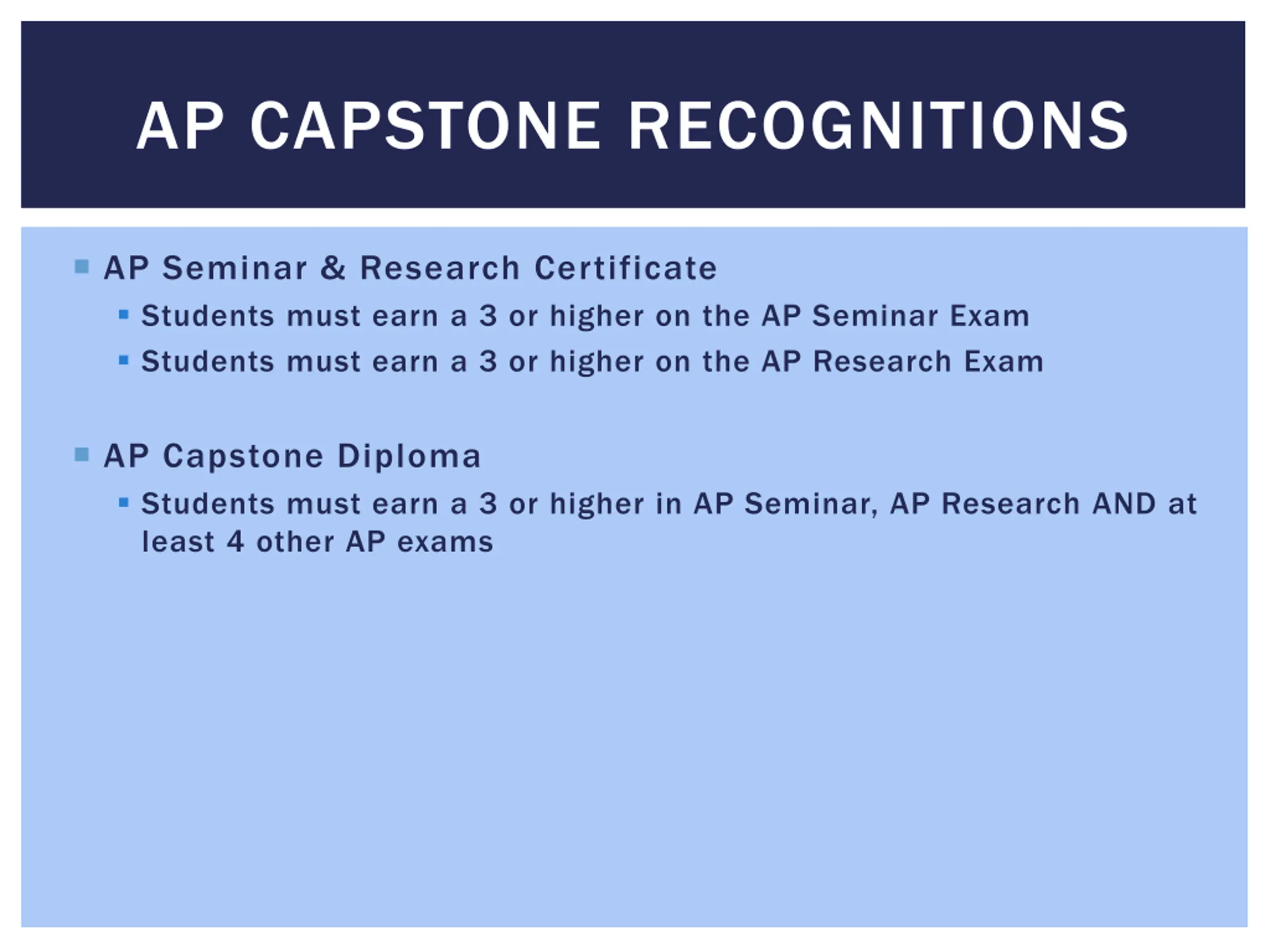 AP CAPSTONE RECOGNITIONS AP Seminar & Research Certificate Students must earn a 3 or higher on the AP Seminar Exam Students must earn a 3 or higher on the AP Research Exam AP Capstone Diploma Students must earn a 3 or higher in AP Seminar, AP Research AND at least 4 other AP exams