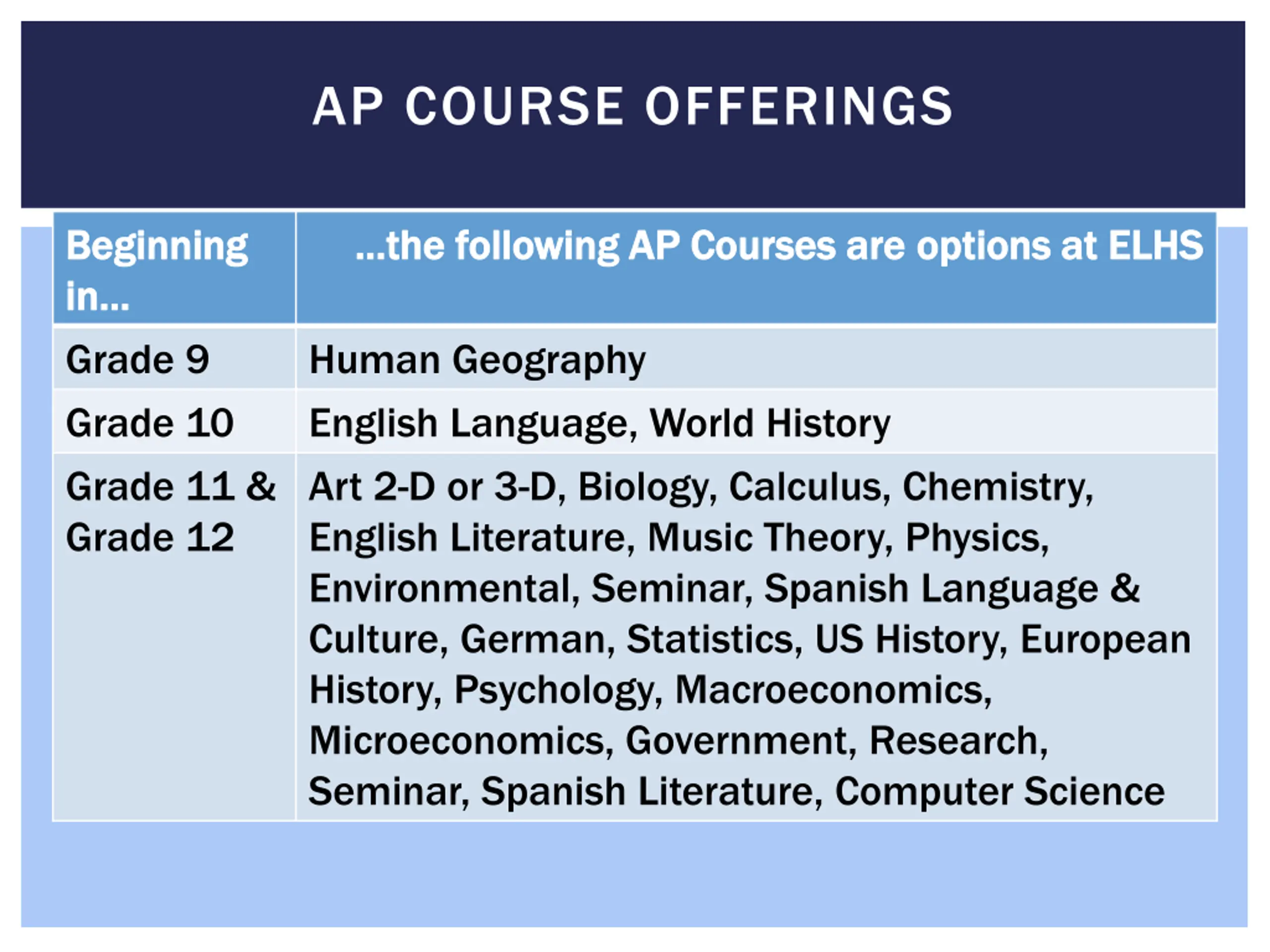 AP COURSE OFFERINGS Beginning Beginning in in Grade 9 Grade 10 Grade 11 & Grade 12 the following AP Courses are the following AP Courses are options at ELHS options at ELHS Human Geography English Language, World History Art 2-D or 3-D, Biology, Calculus, Chemistry, English Literature, Music Theory, Physics, Environmental, Seminar, Spanish Language & Culture, German, Statistics, US History, European History, Psychology, Macroeconomics, Microeconomics, Government, Research, Seminar, Spanish Literature, Computer Science