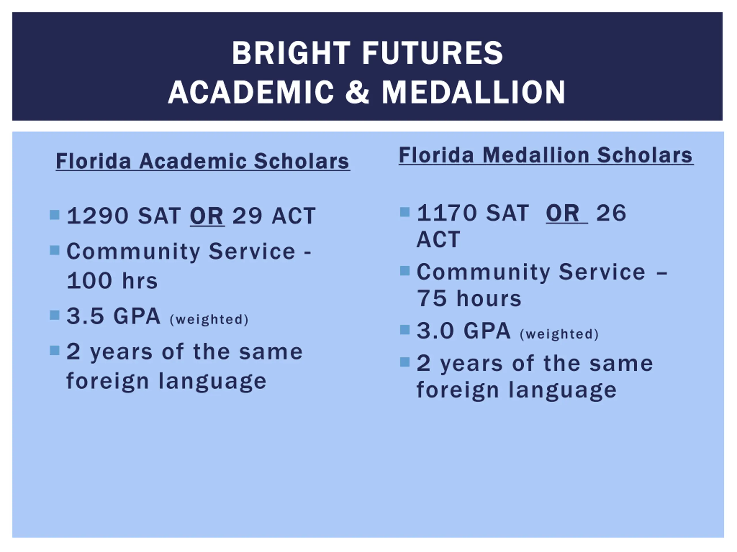 BRIGHT FUTURES BRIGHT FUTURES ACADEMIC & MEDALLION ACADEMIC & MEDALLION Florida Medallion Scholars Florida Medallion Scholars Florida Academic Scholars Florida Academic Scholars 1170 SAT OR ACT Community Service 75 hours 3.0 GPA (weighted) 2 years of the same foreign language OR 26 1290 SAT OR Community Service - 100 hrs 3.5 GPA (weighted) 2 years of the same foreign language OR 29 ACT