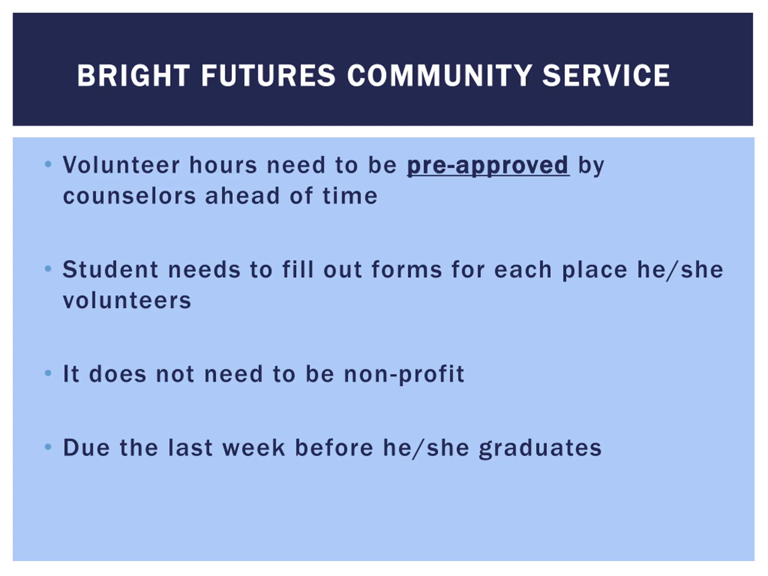 BRIGHT FUTURES COMMUNITY SERVICE BRIGHT FUTURES COMMUNITY SERVICE Volunteer hours need to be pre counselors ahead of time pre- -approved approved by Student needs to fill out forms for each place he/she volunteers It does not need to be non-profit Due the last week before he/she graduates