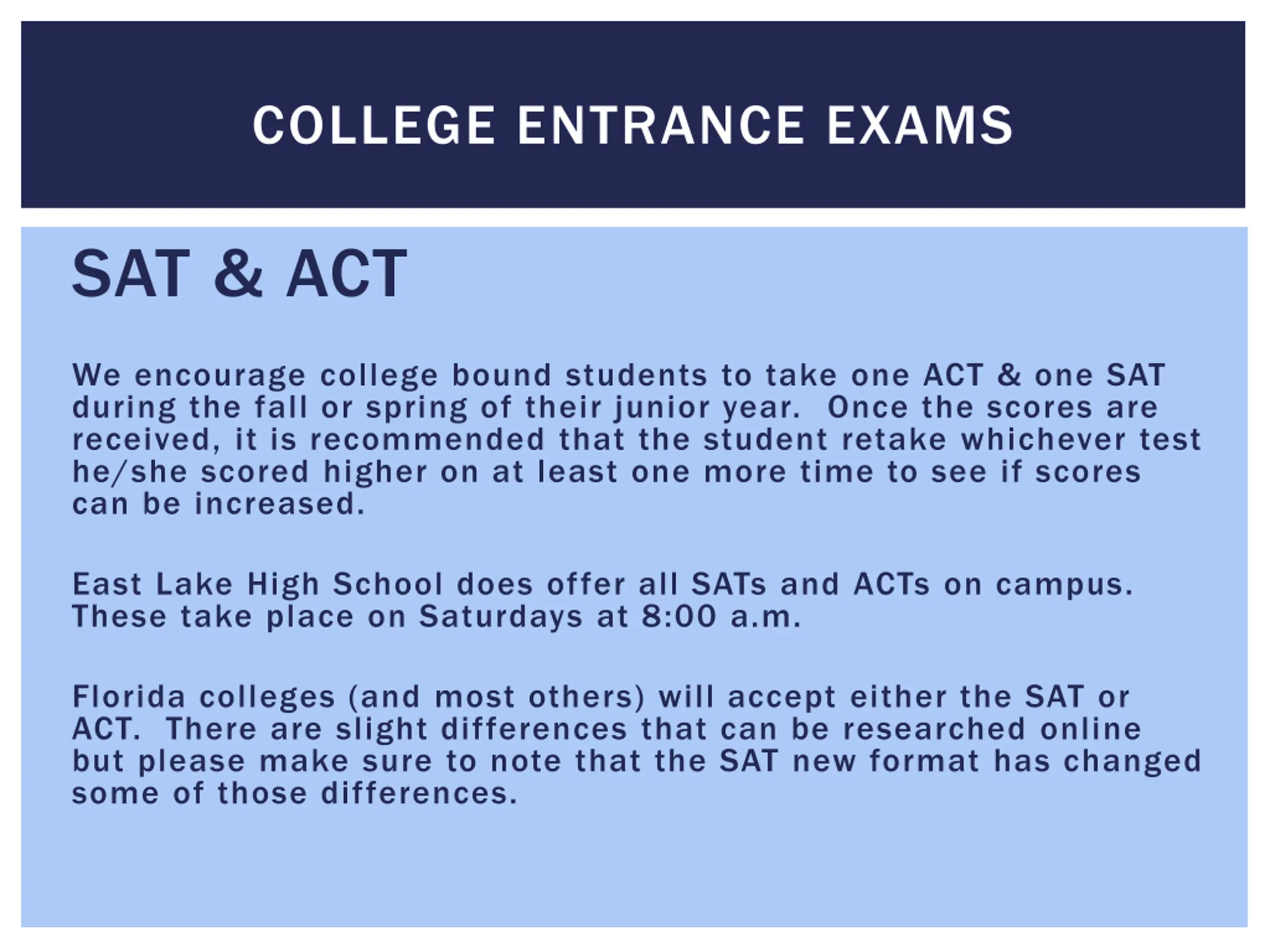 COLLEGE ENTRANCE EXAMS SAT & ACT We encourage college bound students to take one ACT & one SAT during the fall or spring of their junior year. Once the scores are received, it is recommended that the student retake whichever test he/she scored higher on at least one more time to see if scores can be increased. East Lake High School does offer all SATs and ACTs on campus. These take place on Saturdays at 8:00 a.m. Florida colleges (and most others) will accept either the SAT or ACT. There are slight differences that can be researched online but please make sure to note that the SAT new format has changed some of those differences.
