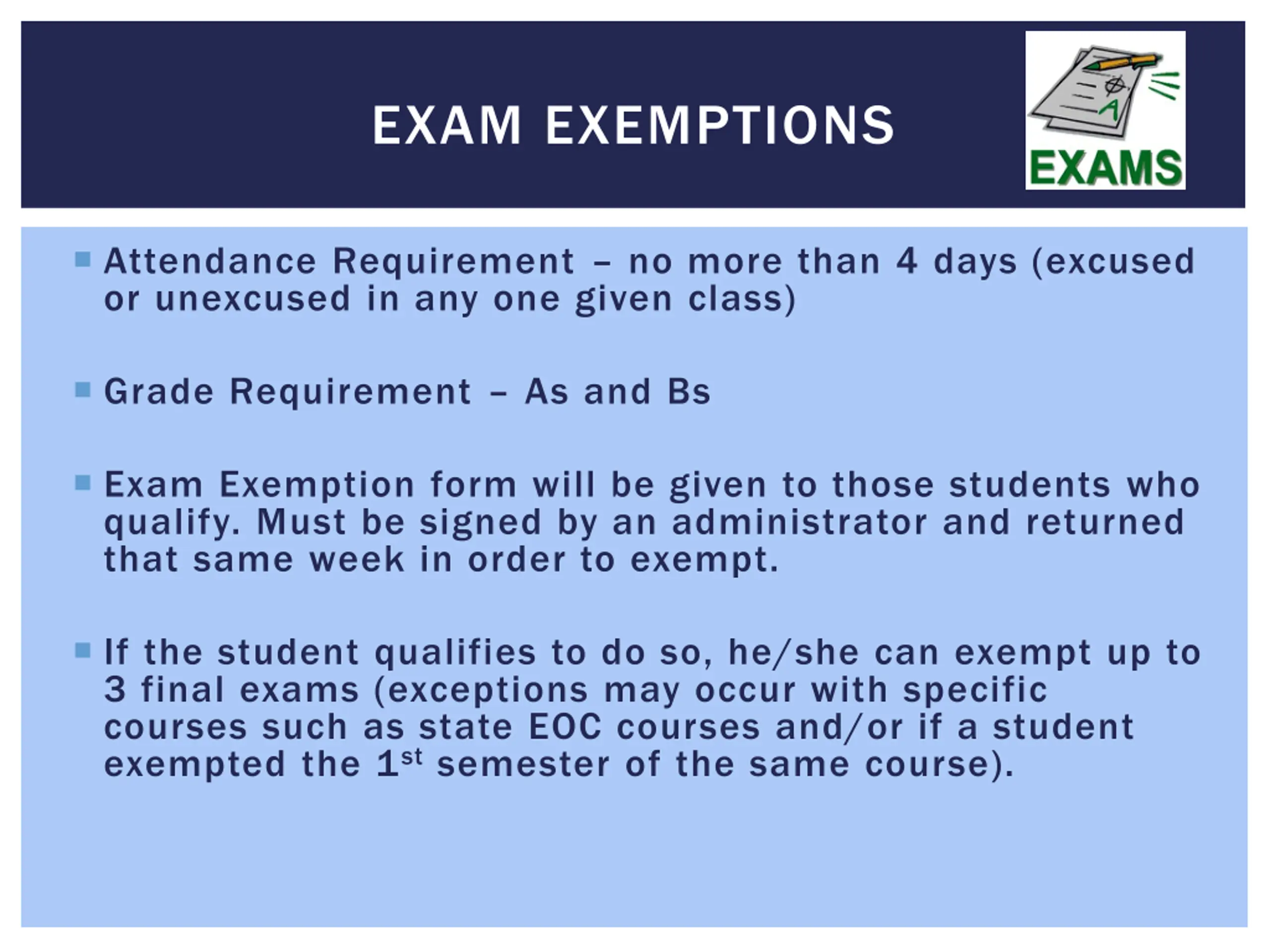 EXAM EXEMPTIONS Attendance Requirement no more than 4 days (excused or unexcused in any one given class) Grade Requirement As and Bs Exam Exemption form will be given to those students who qualify. Must be signed by an administrator and returned that same week in order to exempt. If the student qualifies to do so, he/she can exempt up to 3 final exams (exceptions may occur with specific courses such as state EOC courses and/or if a student exempted the 1stsemester of the same course).