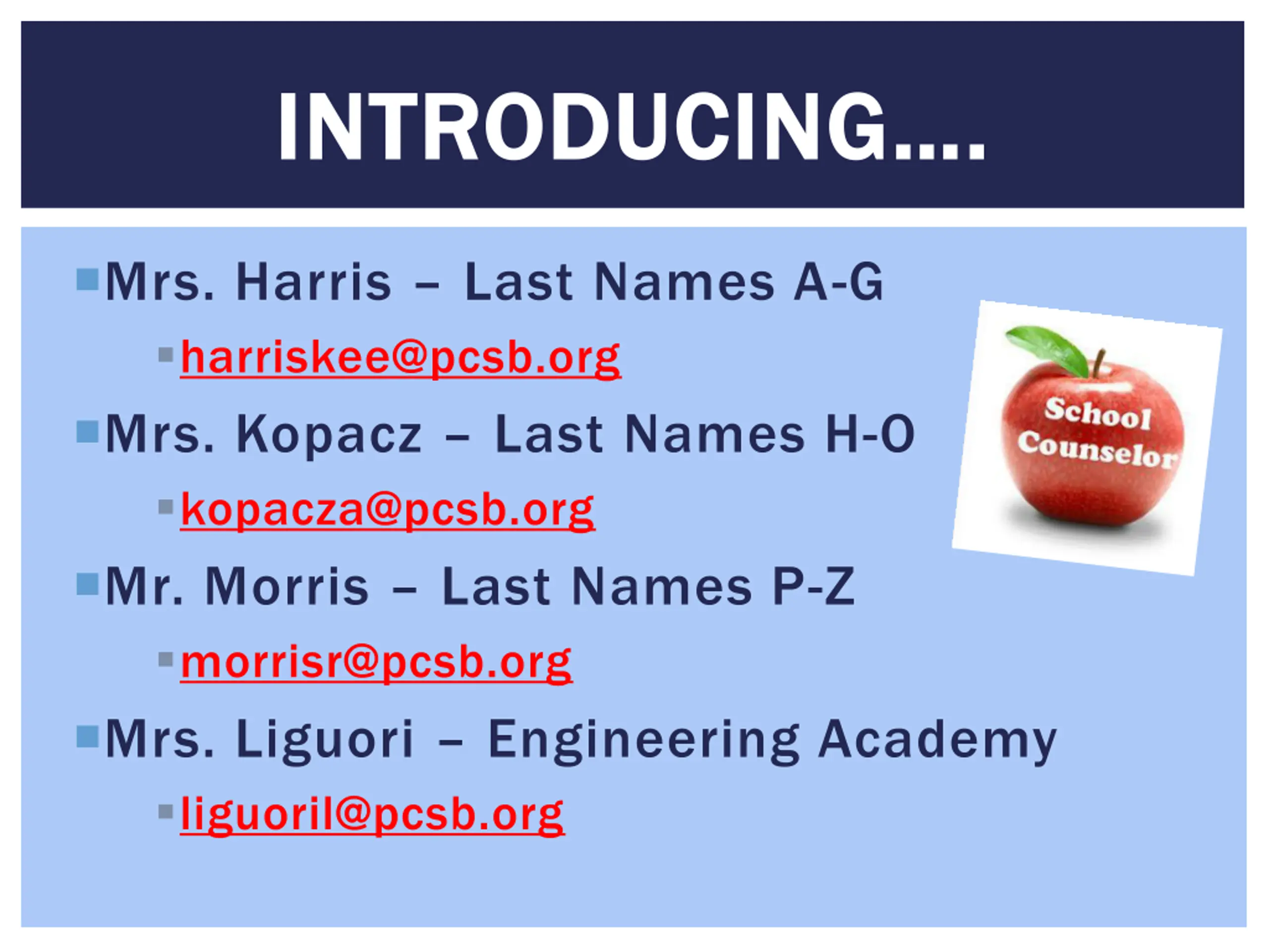 INTRODUCING. INTRODUCING . Mrs. Harris Last Names A-G harriskee@pcsb.org Mrs. Kopacz Last Names H-O kopacza@pcsb.org Mr. Morris Last Names P-Z morrisr@pcsb.org Mrs. Liguori Engineering Academy liguoril@pcsb.org