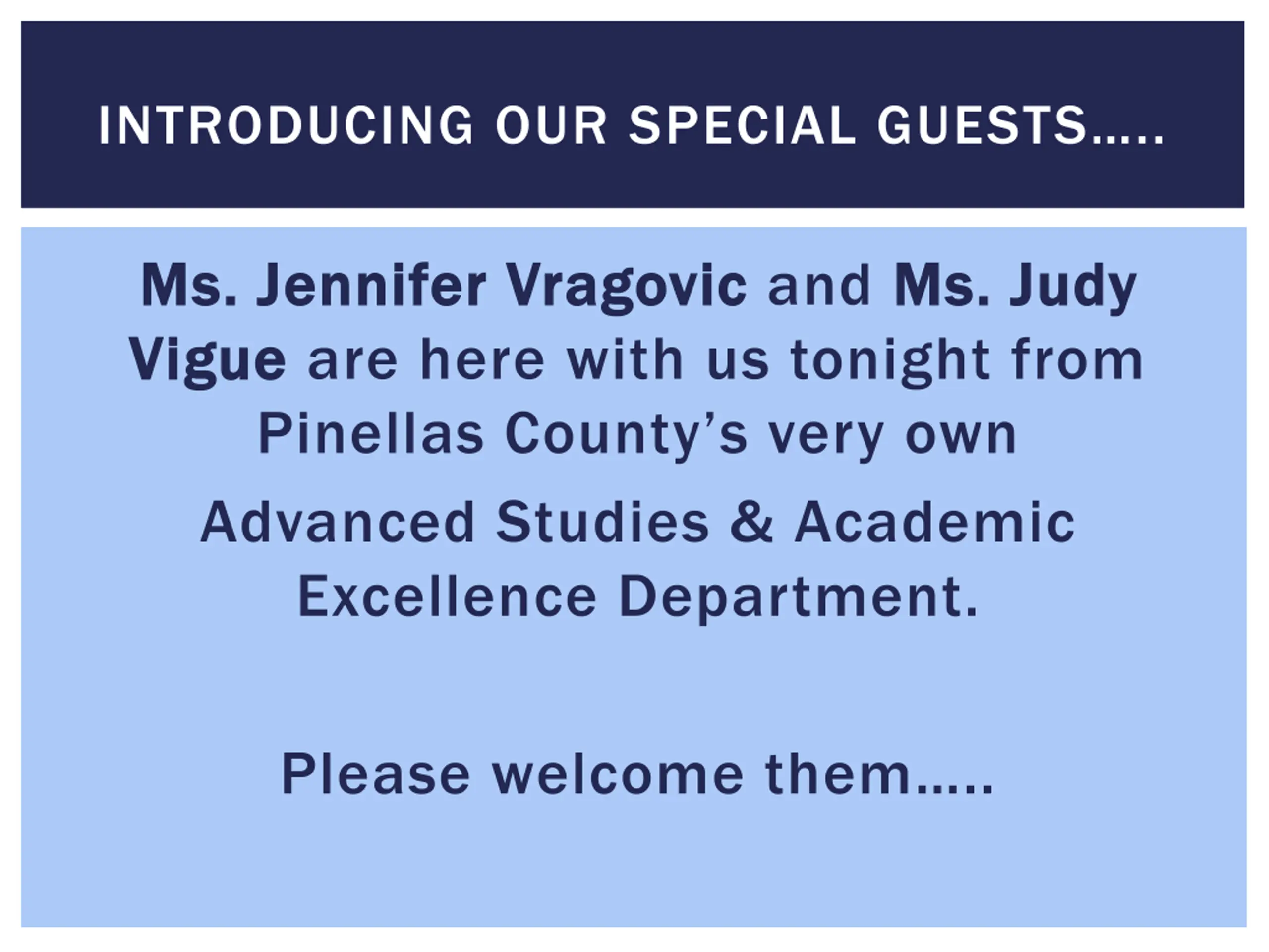INTRODUCING OUR SPECIAL GUESTS.. Ms. Jennifer Ms. Jennifer Vragovic Vigue Vigue are here with us tonight from Pinellas County s very own Advanced Studies & Academic Excellence Department. Vragovic and Ms. Judy Ms. Judy Please welcome them ..