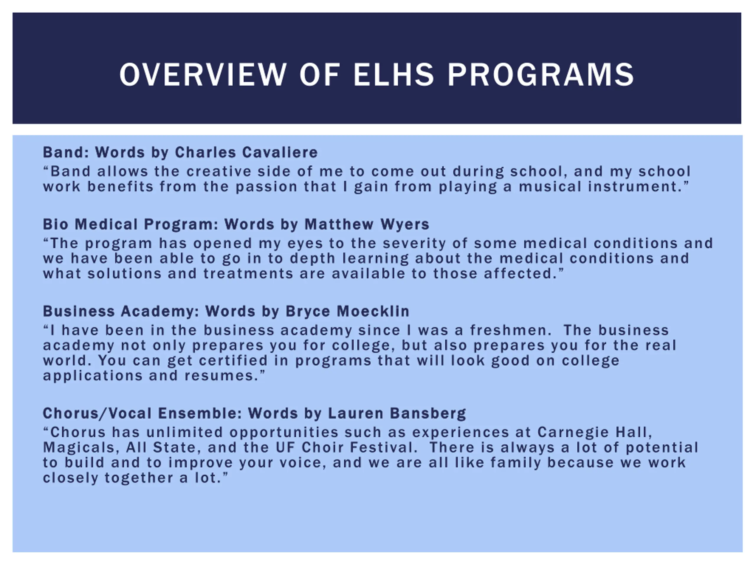 OVERVIEW OF ELHS PROGRAMS Band: Words by Charles Cavaliere Band: Words by Charles Cavaliere Band allows the creative side of me to come out during school, and my school work benefits from the passion that I gain from playing a musical instrument. Bio Medical Program: Words by Matthew Bio Medical Program: Words by Matthew Wyers The program has opened my eyes to the severity of some medical conditions and we have been able to go in to depth learning about the medical conditions and what solutions and treatments are available to those affected. Wyers Business Academy: Business Academy: Words I have been in the business academy since I was a freshmen. The business academy not only prepares you for college, but also prepares you for the real world. You can get certified in programs that will look good on college applications and resumes. Words by Bryce by Bryce Moecklin Moecklin Chorus/Vocal Chorus/Vocal Ensemble: Words by Lauren Bansberg Ensemble: Words by Lauren Bansberg Chorus has unlimited opportunities such as experiences at Carnegie Hall, Magicals, All State, and the UF Choir Festival. There is always a lot of potential to build and to improve your voice, and we are all like family because we work closely together a lot.
