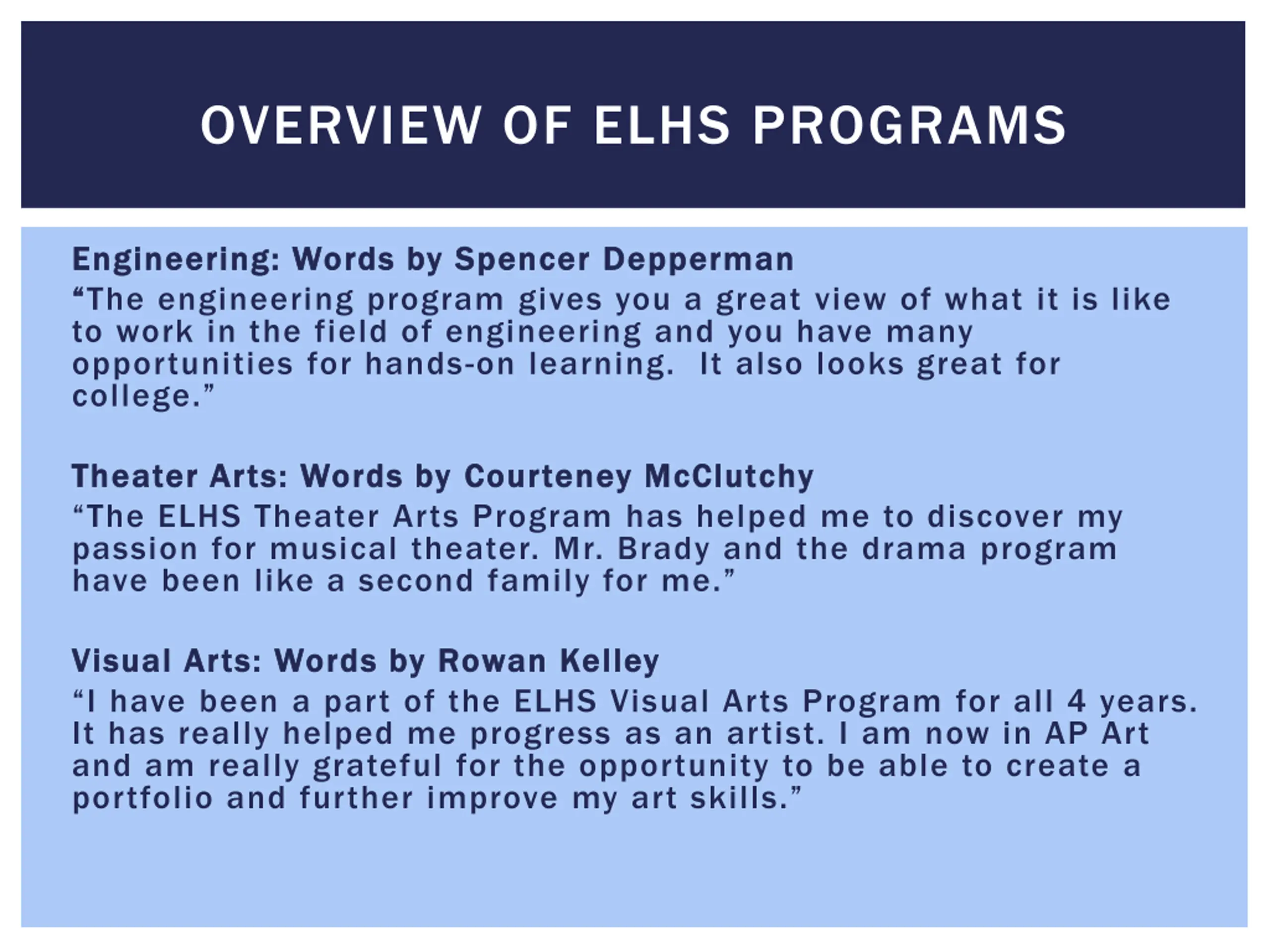 OVERVIEW OF ELHS PROGRAMS Engineering: Words by Spencer Engineering: Words by Spencer Depperman The engineering program gives you a great view of what it is like to work in the field of engineering and you have many opportunities for hands-on learning. It also looks great for college. Depperman Theater Arts: Words by Theater Arts: Words by Courteney The ELHS Theater Arts Program has helped me to discover my passion for musical theater. Mr. Brady and the drama program have been like a second family for me. Courteney McClutchy McClutchy Visual Arts: Words by Rowan Kelley Visual Arts: Words by Rowan Kelley I have been a part of the ELHS Visual Arts Program for all 4 years. It has really helped me progress as an artist. I am now in AP Art and am really grateful for the opportunity to be able to create a portfolio and further improve my art skills.