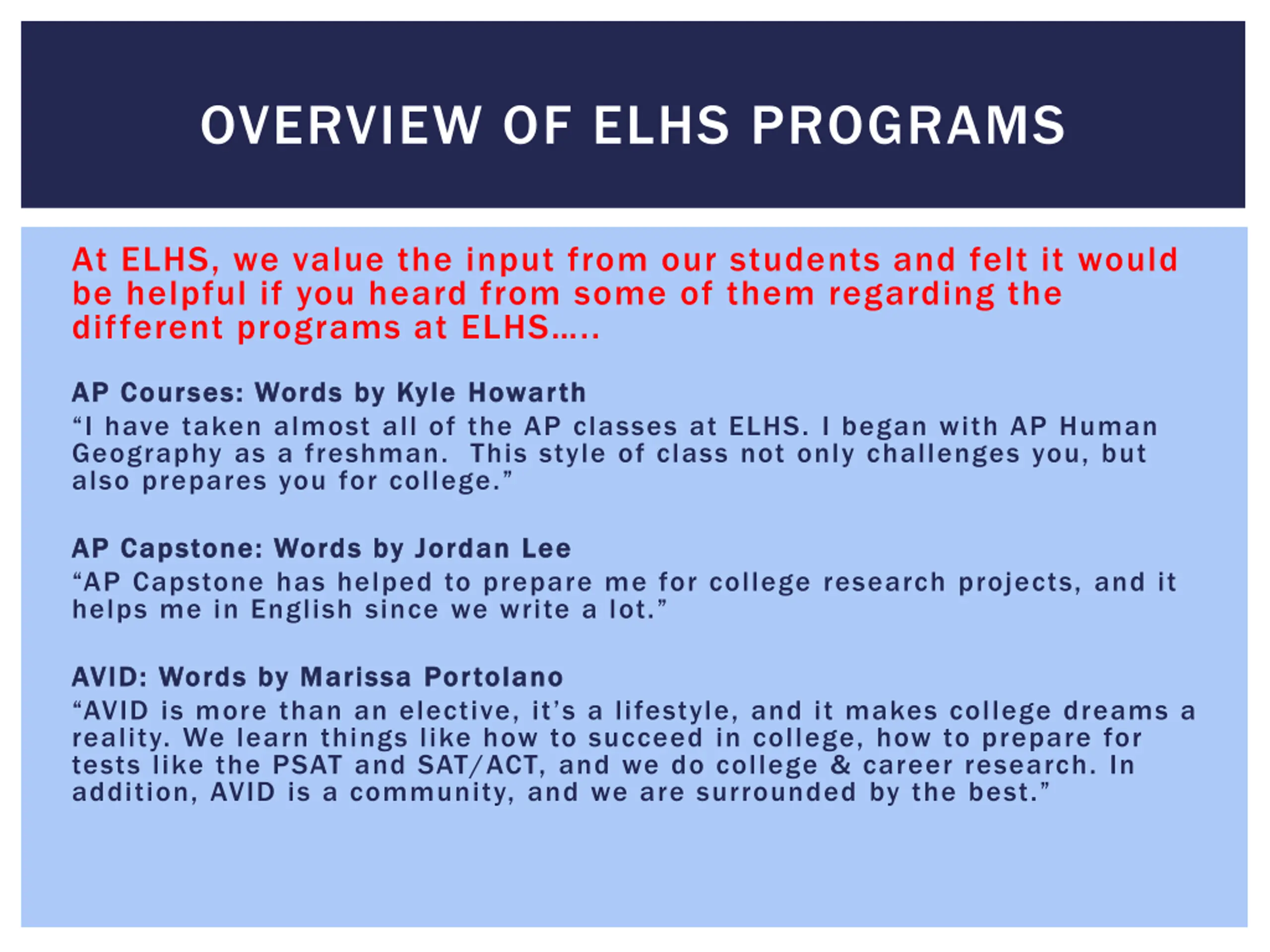 OVERVIEW OF ELHS PROGRAMS At ELHS, we value the input from our students and felt it would be helpful if you heard from some of them regarding the different programs at ELHS .. AP Courses: Words by Kyle AP Courses: Words by Kyle Howarth I have taken almost all of the AP classes at ELHS. I began with AP Human Geography as a freshman. This style of class not only challenges you, but also prepares you for college. Howarth AP Capstone: Words by Jordan Lee AP Capstone: Words by Jordan Lee AP Capstone has helped to prepare me for college research projects, and it helps me in English since we write a lot. AVID: Words by Marissa AVID: Words by Marissa Portolano AVID is more than an elective, it s a lifestyle, and it makes college dreams a reality. We learn things like how to succeed in college, how to prepare for tests like the PSAT and SAT/ACT, and we do college & career research. In addition, AVID is a community, and we are surrounded by the best. Portolano