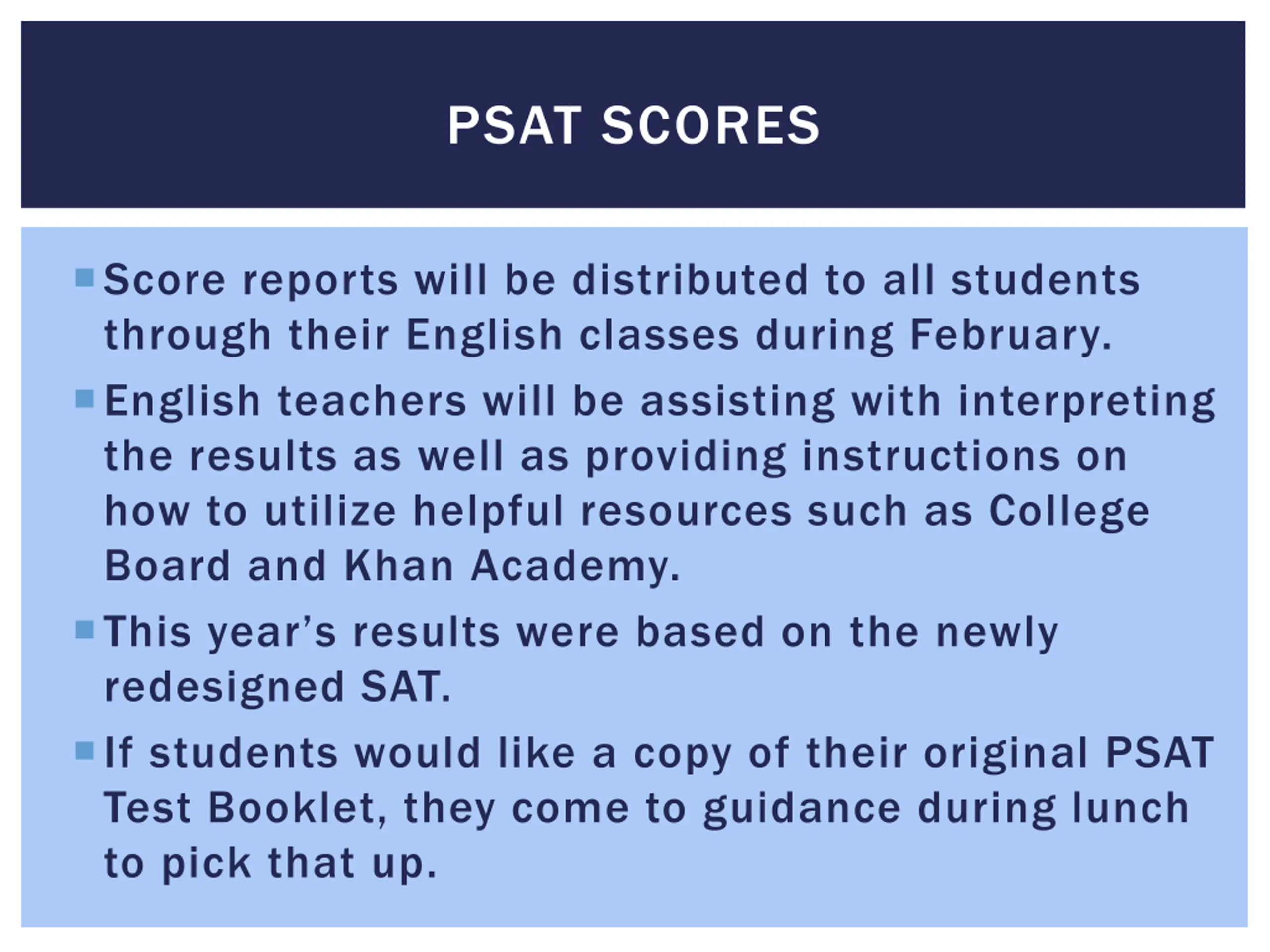 PSAT SCORES Score reports will be distributed to all students through their English classes during February. English teachers will be assisting with interpreting the results as well as providing instructions on how to utilize helpful resources such as College Board and Khan Academy. This year s results were based on the newly redesigned SAT. If students would like a copy of their original PSAT Test Booklet, they come to guidance during lunch to pick that up.