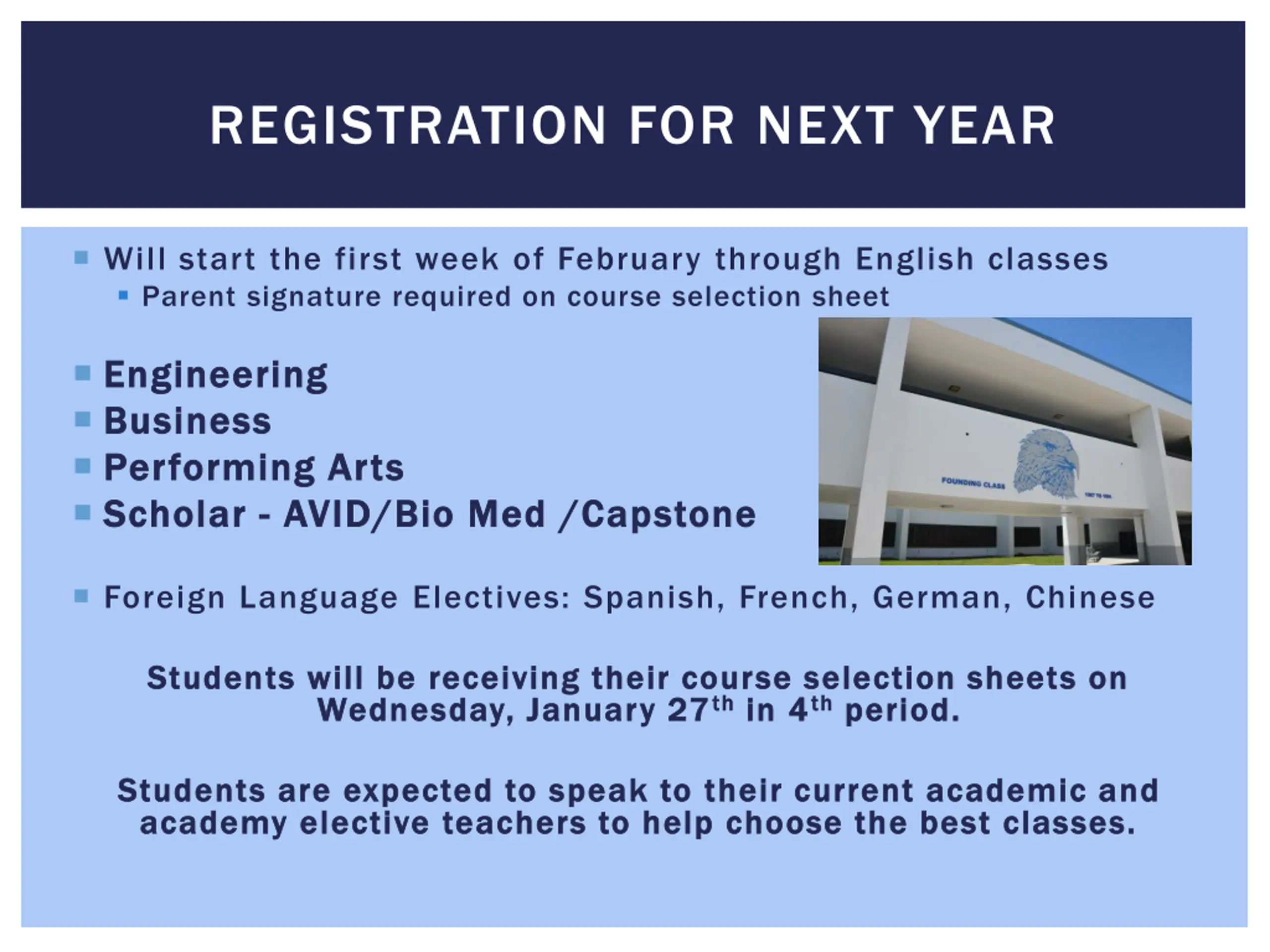 REGISTRATION FOR NEXT YEAR Will start the first week of February through English classes Parent signature required on course selection sheet Engineering Engineering Business Business Performing Arts Performing Arts Scholar Scholar - - AVID/Bio Med /Capstone AVID/Bio Med /Capstone Foreign Language Electives: Spanish, French, German, Chinese Students will be receiving their course selection sheets on Students will be receiving their course selection sheets on Wednesday, January 27 Wednesday, January 27th thin 4 in 4th thperiod. period. Students are expected to speak to their current academic and Students are expected to speak to their current academic and academy elective teachers to help choose the best classes. academy elective teachers to help choose the best classes.