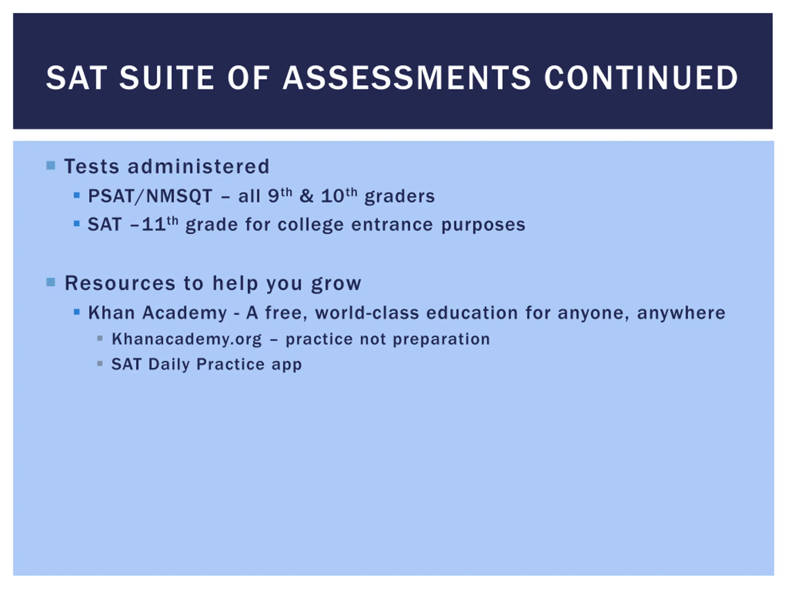 SAT SUITE OF ASSESSMENTS CONTINUED Tests administered PSAT/NMSQT all 9th& 10thgraders SAT 11thgrade for college entrance purposes Resources to help you grow Khan Academy - A free, world-class education for anyone, anywhere Khanacademy.org practice not preparation SAT Daily Practice app