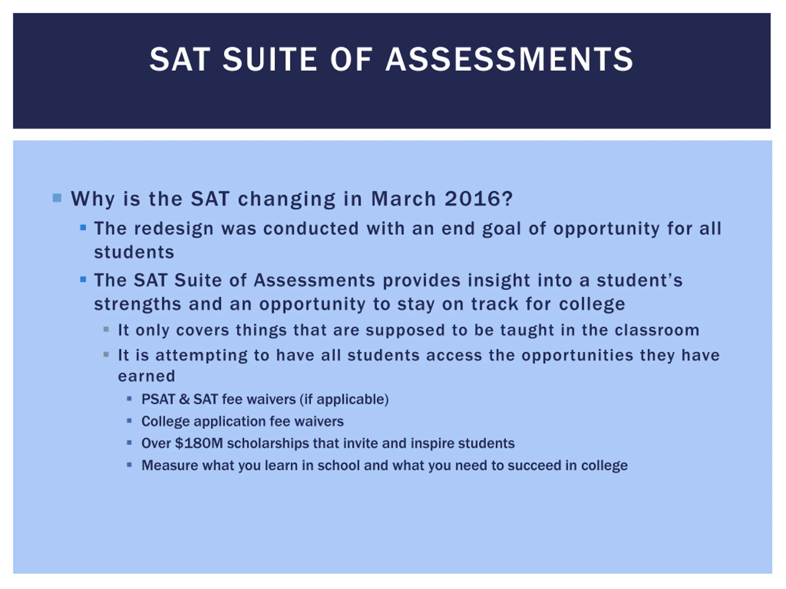 SAT SUITE OF ASSESSMENTS Why is the SAT changing in March 2016? The redesign was conducted with an end goal of opportunity for all students The SAT Suite of Assessments provides insight into a student s strengths and an opportunity to stay on track for college It only covers things that are supposed to be taught in the classroom It is attempting to have all students access the opportunities they have earned PSAT & SAT fee waivers (if applicable) College application fee waivers Over $180M scholarships that invite and inspire students Measure what you learn in school and what you need to succeed in college