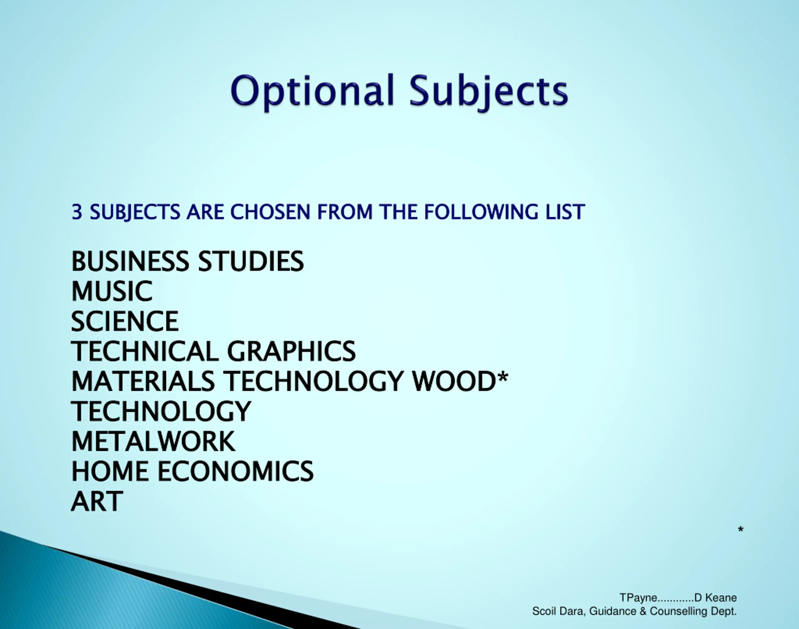 3 SUBJECTS ARE CHOSEN FROM THE FOLLOWING LIST 3 SUBJECTS ARE CHOSEN FROM THE FOLLOWING LIST BUSINESS STUDIES MUSIC SCIENCE TECHNICAL GRAPHICS MATERIALS TECHNOLOGY WOOD* TECHNOLOGY METALWORK HOME ECONOMICS ART BUSINESS STUDIES MUSIC SCIENCE TECHNICAL GRAPHICS MATERIALS TECHNOLOGY WOOD* TECHNOLOGY METALWORK HOME ECONOMICS ART * * TPayne............D Keane Scoil Dara, Guidance & Counselling Dept.