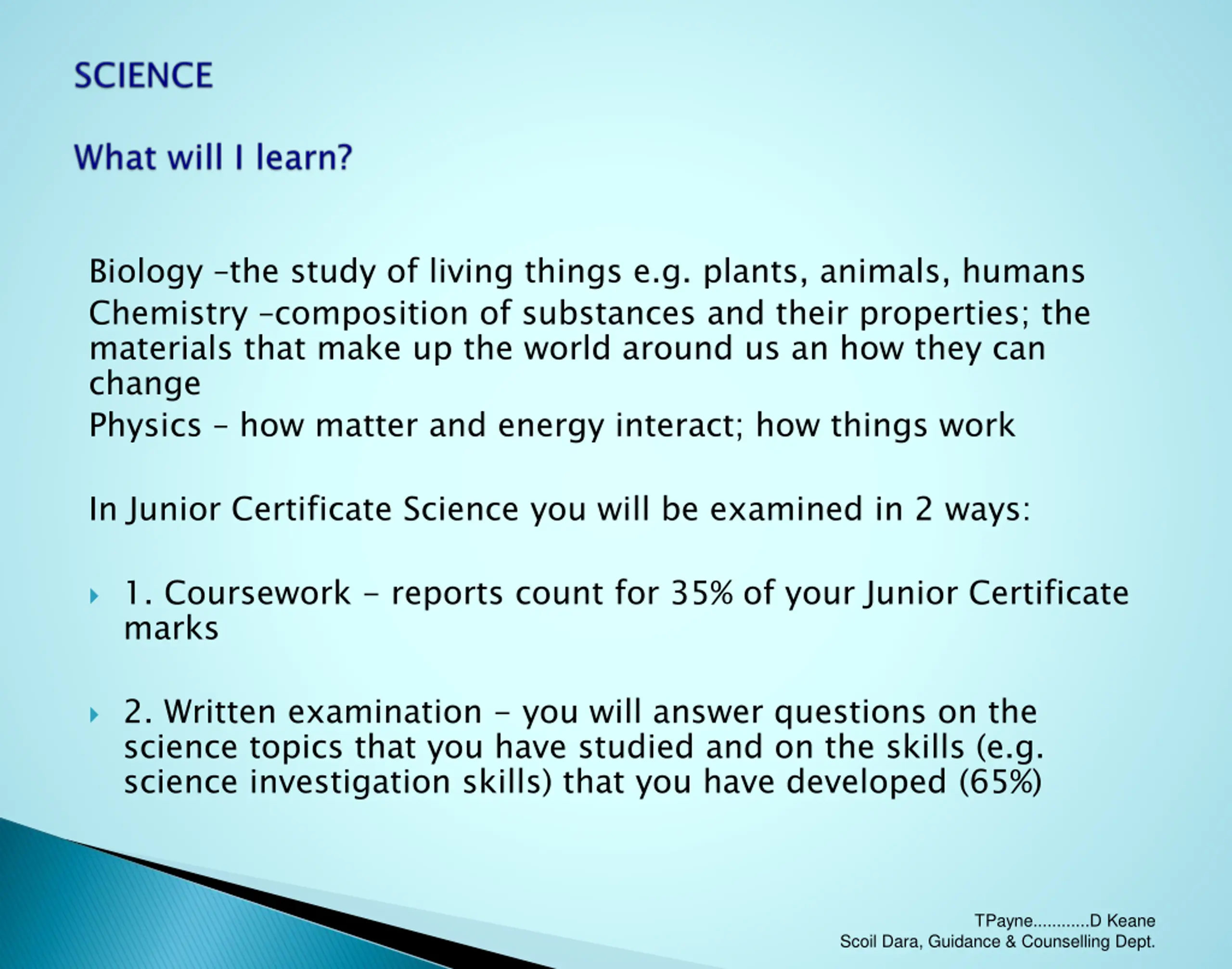 Biology the study of living things e.g. plants, animals, humans Chemistry composition of substances and their properties; the materials that make up the world around us an how they can change Physics how matter and energy interact; how things work In Junior Certificate Science you will be examined in 2 ways: 1. Coursework - reports count for 35% of your Junior Certificate marks 2. Written examination - you will answer questions on the science topics that you have studied and on the skills (e.g. science investigation skills) that you have developed (65%) TPayne............D Keane Scoil Dara, Guidance & Counselling Dept.