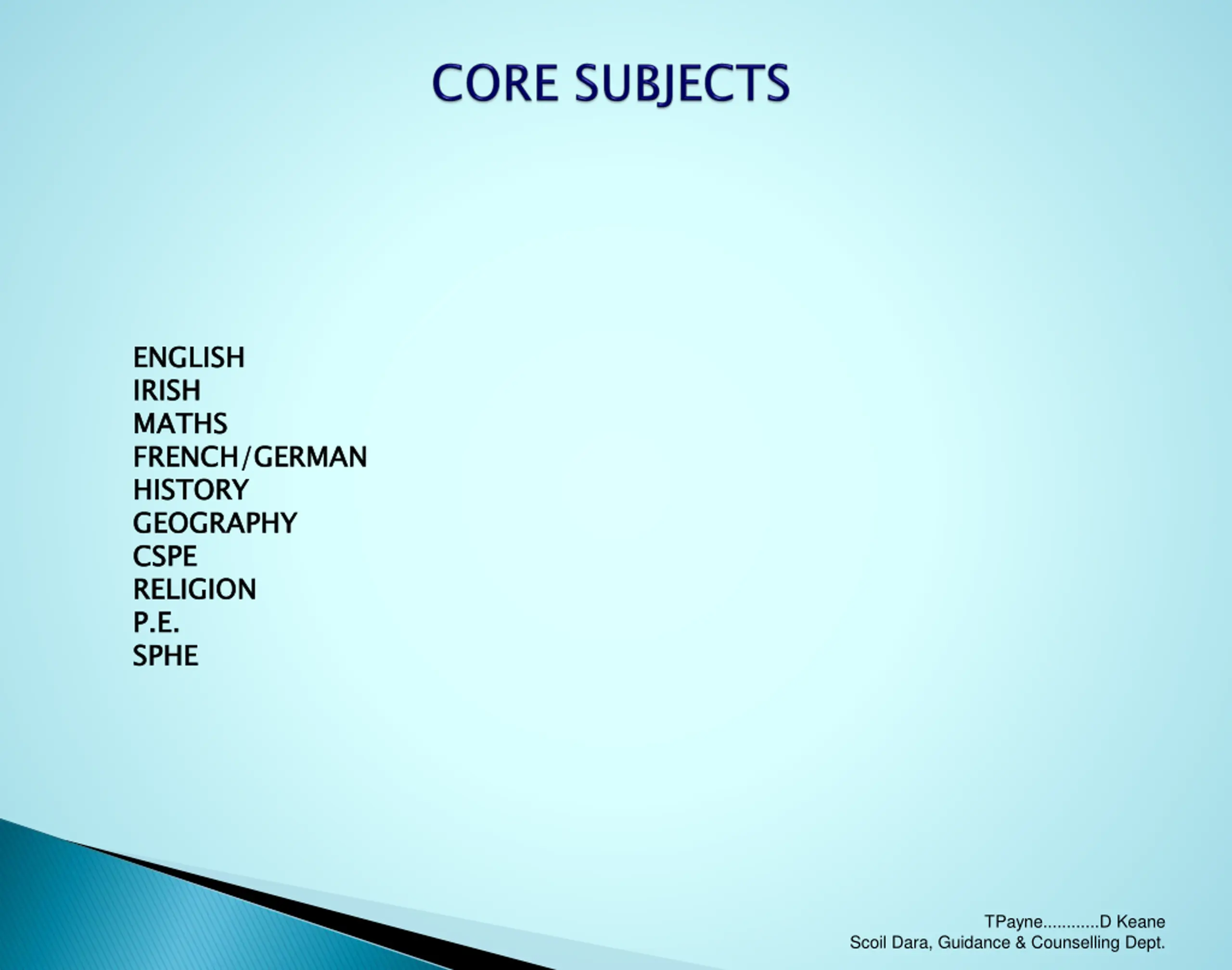 ENGLISH IRISH MATHS FRENCH/GERMAN HISTORY GEOGRAPHY CSPE RELIGION P.E. SPHE ENGLISH IRISH MATHS FRENCH/GERMAN HISTORY GEOGRAPHY CSPE RELIGION P.E. SPHE TPayne............D Keane Scoil Dara, Guidance & Counselling Dept.