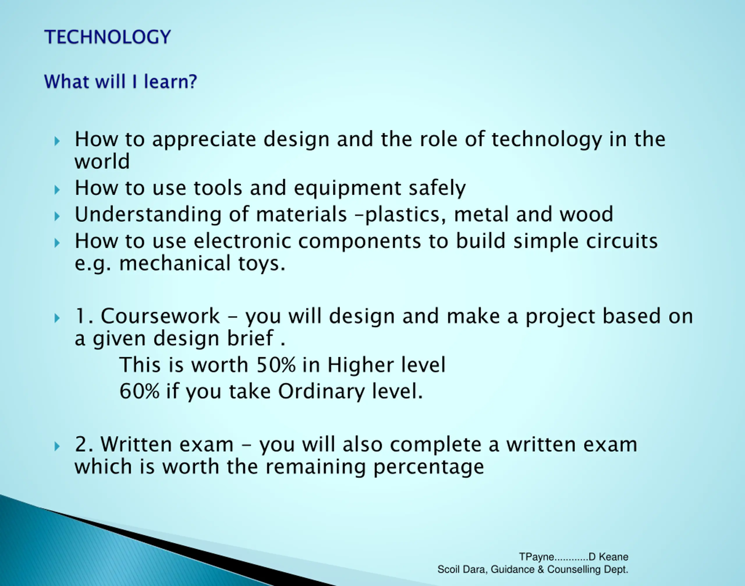 How to appreciate design and the role of technology in the world How to use tools and equipment safely Understanding of materials plastics, metal and wood How to use electronic components to build simple circuits e.g. mechanical toys. 1. Coursework - you will design and make a project based on a given design brief . This is worth 50% in Higher level 60% if you take Ordinary level. 2. Written exam - you will also complete a written exam which is worth the remaining percentage TPayne............D Keane Scoil Dara, Guidance & Counselling Dept.
