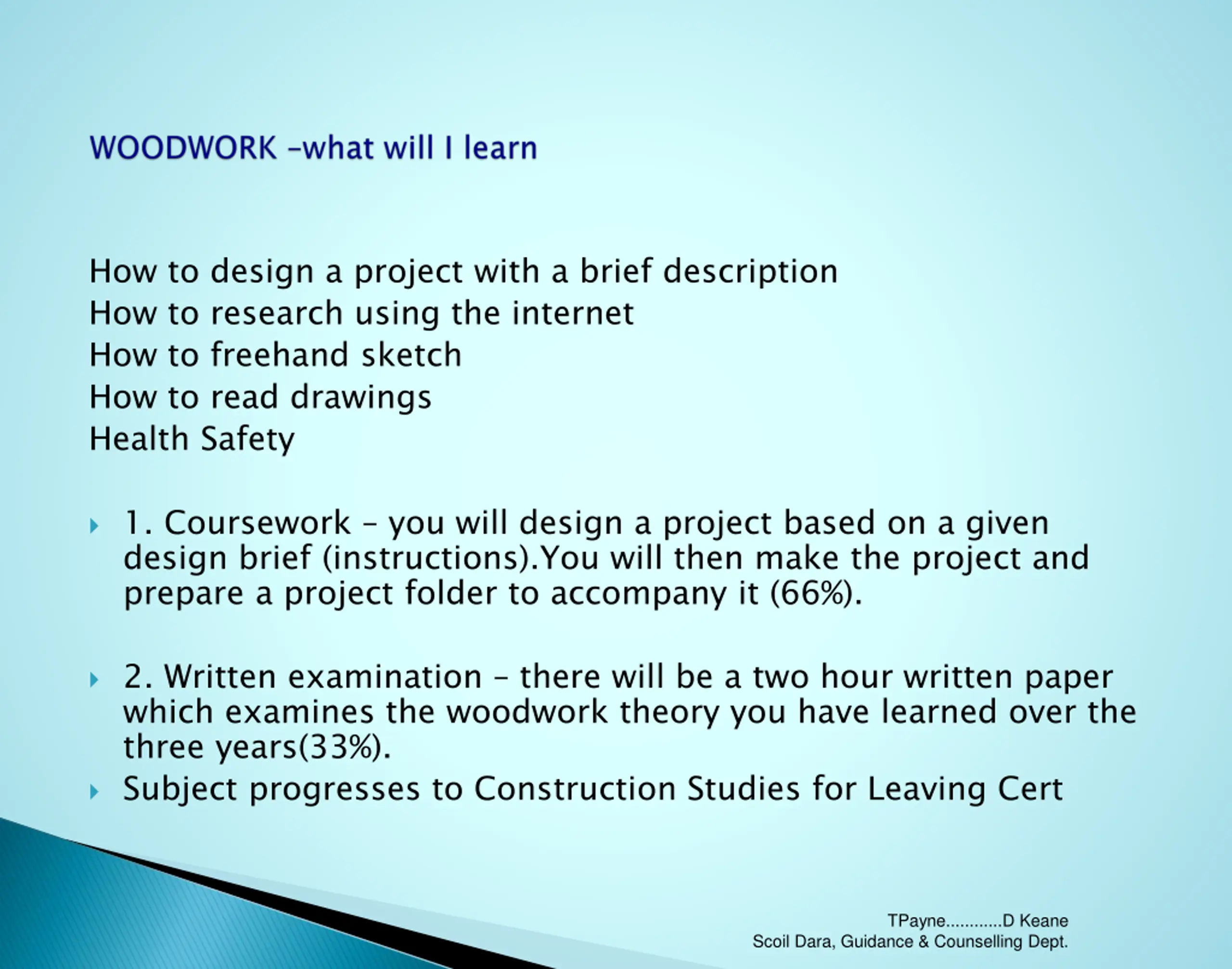 How to design a project with a brief description How to research using the internet How to freehand sketch How to read drawings Health Safety 1. Coursework you will design a project based on a given design brief (instructions).You will then make the project and prepare a project folder to accompany it (66%). 2. Written examination there will be a two hour written paper which examines the woodwork theory you have learned over the three years(33%). Subject progresses to Construction Studies for Leaving Cert TPayne............D Keane Scoil Dara, Guidance & Counselling Dept.