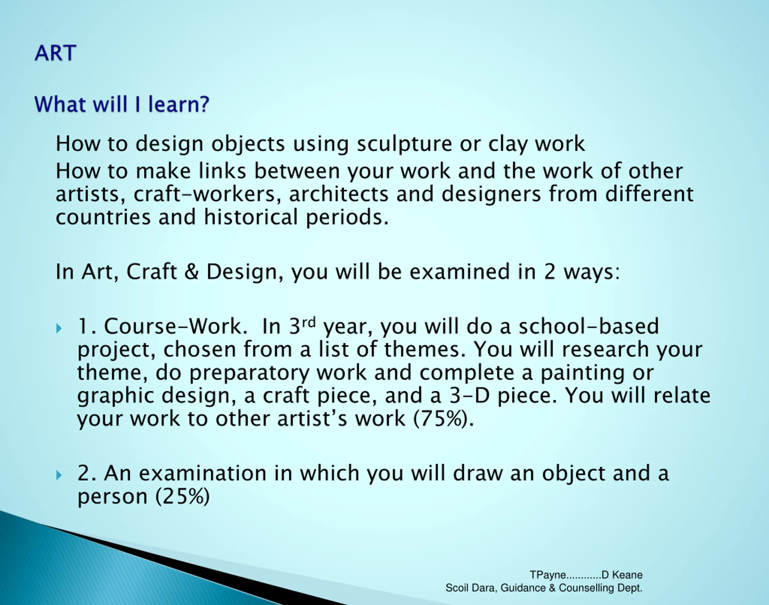 How to design objects using sculpture or clay work How to make links between your work and the work of other artists, craft-workers, architects and designers from different countries and historical periods. In Art, Craft & Design, you will be examined in 2 ways: 1. Course-Work. In 3rd year, you will do a school-based project, chosen from a list of themes. You will research your theme, do preparatory work and complete a painting or graphic design, a craft piece, and a 3-D piece. You will relate your work to other artist s work (75%). 2. An examination in which you will draw an object and a person (25%) TPayne............D Keane Scoil Dara, Guidance & Counselling Dept.