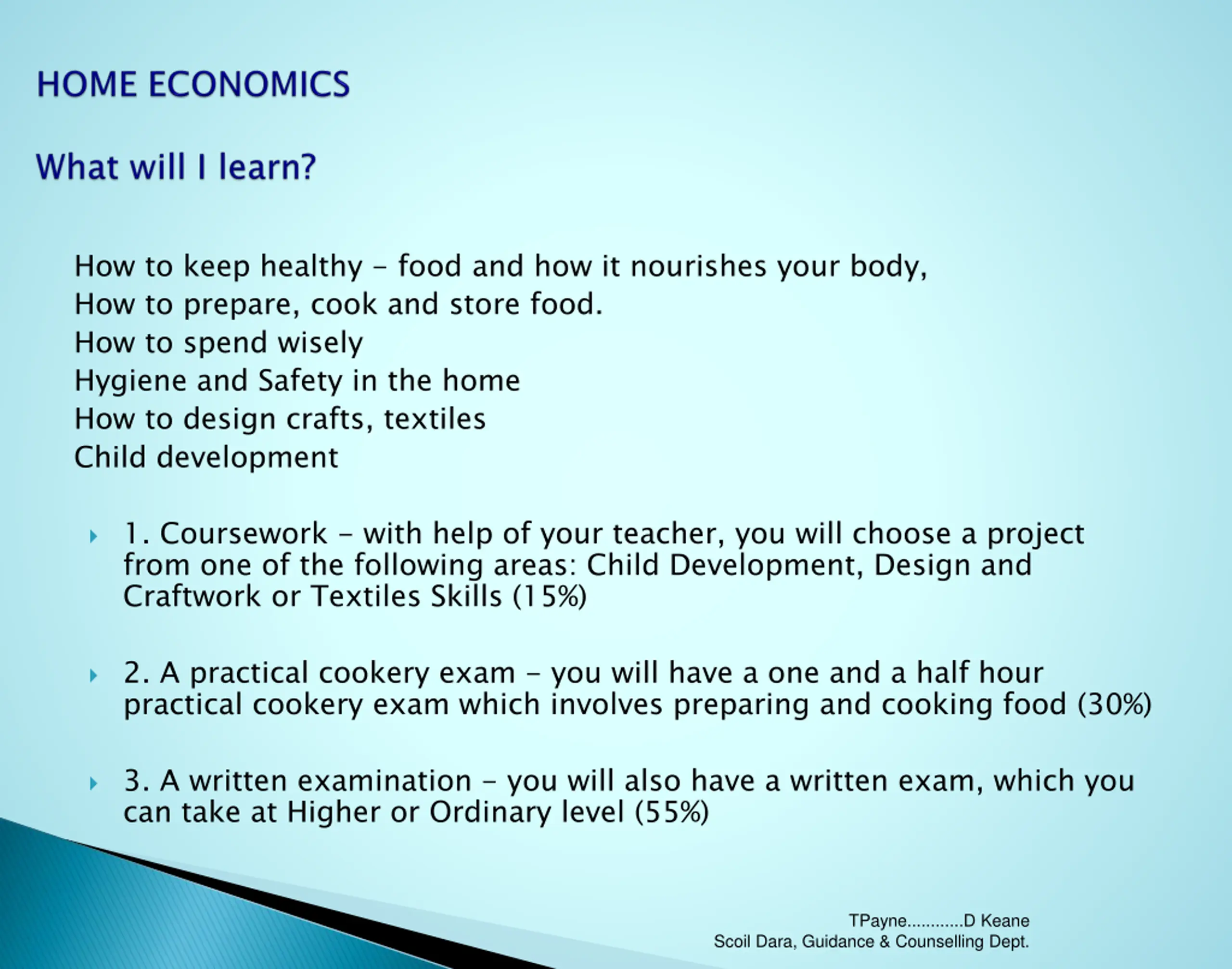 How to keep healthy - food and how it nourishes your body, How to prepare, cook and store food. How to spend wisely Hygiene and Safety in the home How to design crafts, textiles Child development 1. Coursework - with help of your teacher, you will choose a project from one of the following areas: Child Development, Design and Craftwork or Textiles Skills (15%) 2. A practical cookery exam - you will have a one and a half hour practical cookery exam which involves preparing and cooking food (30%) 3. A written examination - you will also have a written exam, which you can take at Higher or Ordinary level (55%) TPayne............D Keane Scoil Dara, Guidance & Counselling Dept.